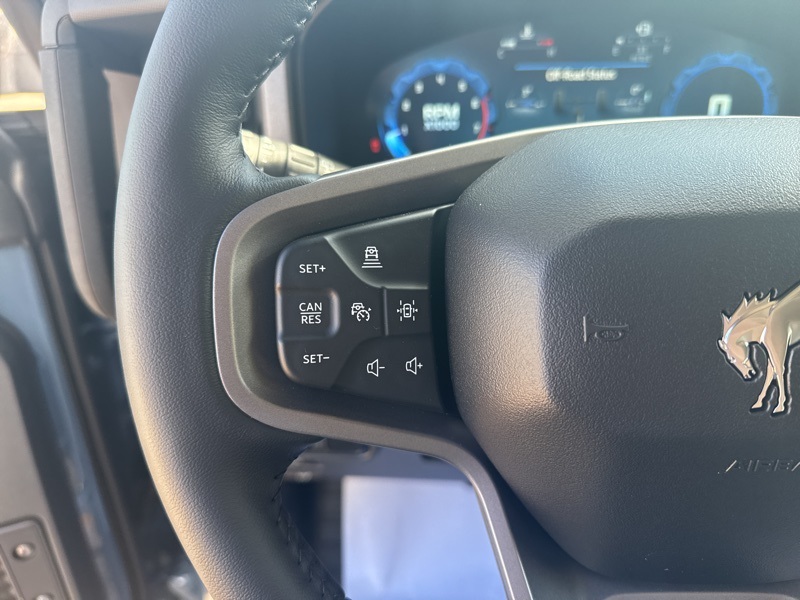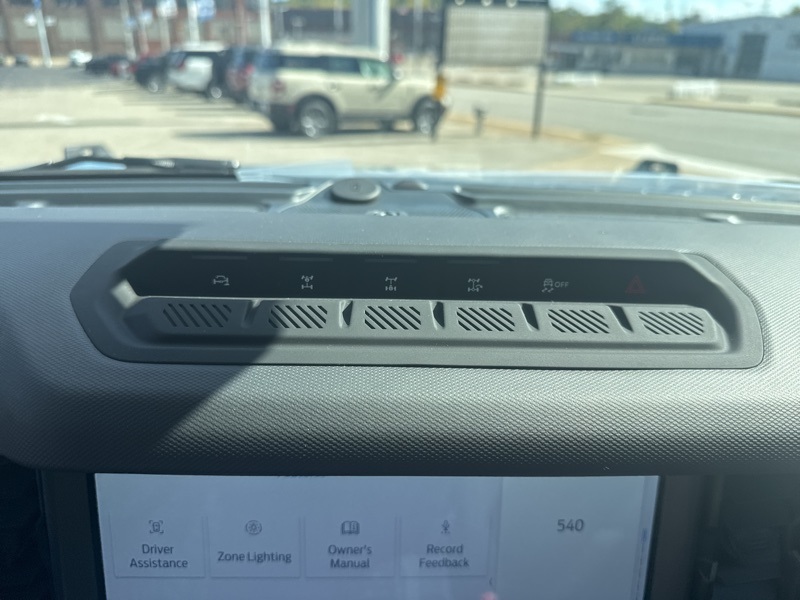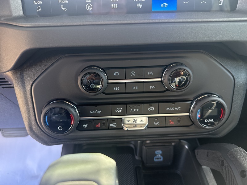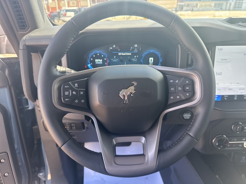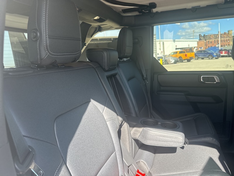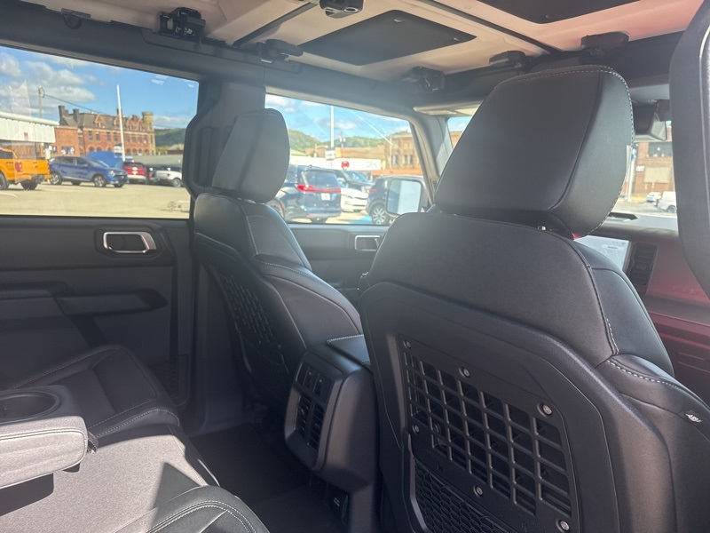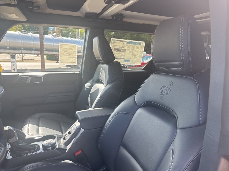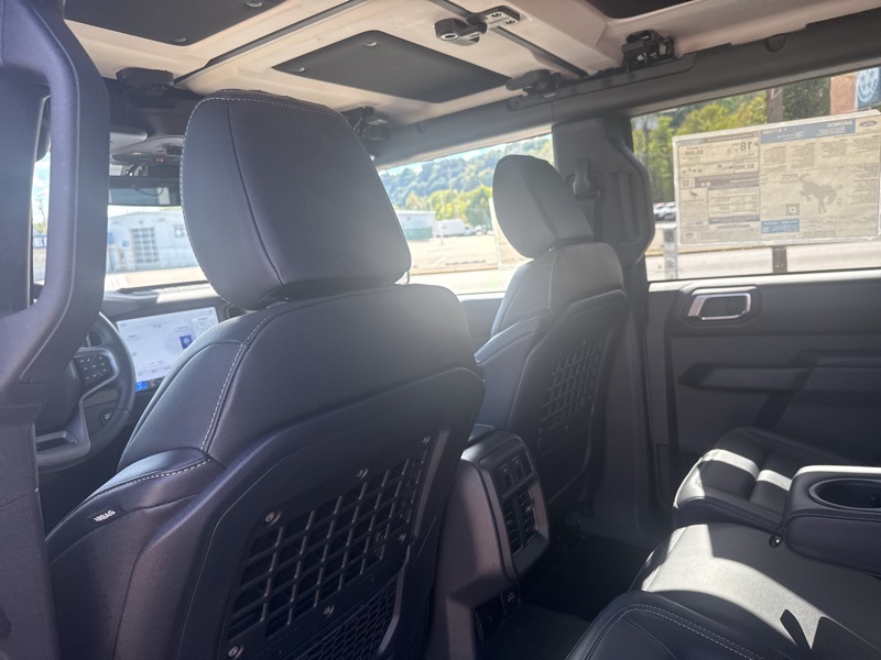 Inside, its all business - black Onyx vinyl seats built to take a beating and wipe clean after your latest trail victory. But rugged doesn't mean rough. You still get heated front seats, dual-zone electronic climate control, and a 12-inch touchscreen with SYNC 4, built-in navigation, and a premium 12-speaker B&O sound system that turns every ride into a concert on wheels. The digital cluster, leather-wrapped wheel, and MOLLE strap system blend tech and toughness like only a Bronco can.