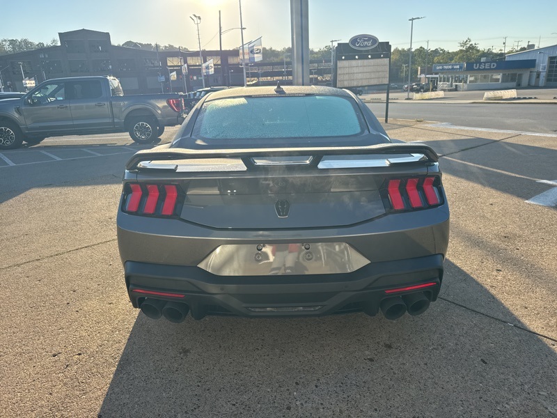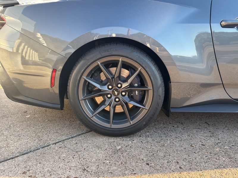 The 2025 Ford Mustang Dark Horse doesn't whisper performance, it shouts it from the redline. Dressed in Carbonized Gray Metallic with those sinister Blue Recaro Dinamica performance seats, this coupe looks like it was built in a wind tunnel and trained on a racetrack. Beneath the sculpted hood lives a 5.0L DOHC V8 mated to a Tremec 6-speed manual, because real drivers still shift for themselves. One press of the starter button, and that active valve performance exhaust barks to life with the kind of authority that makes garage doors tremble and bystanders turn.