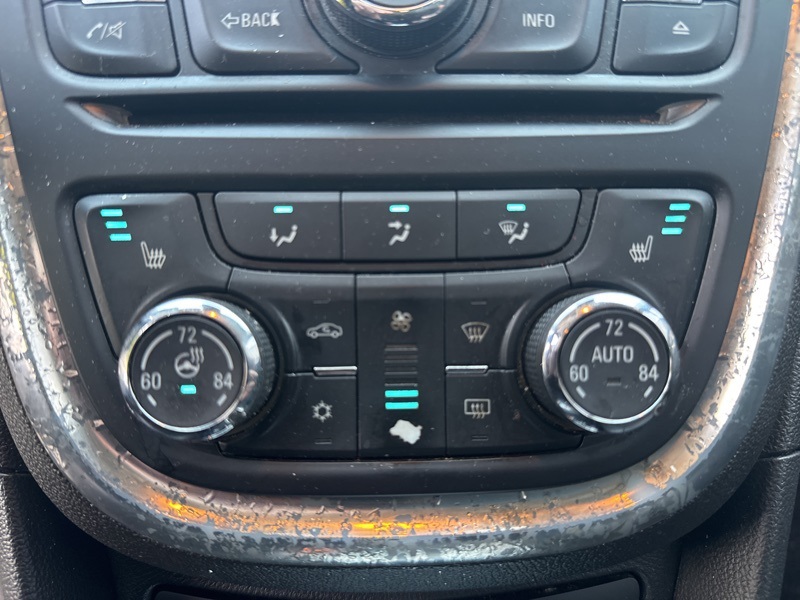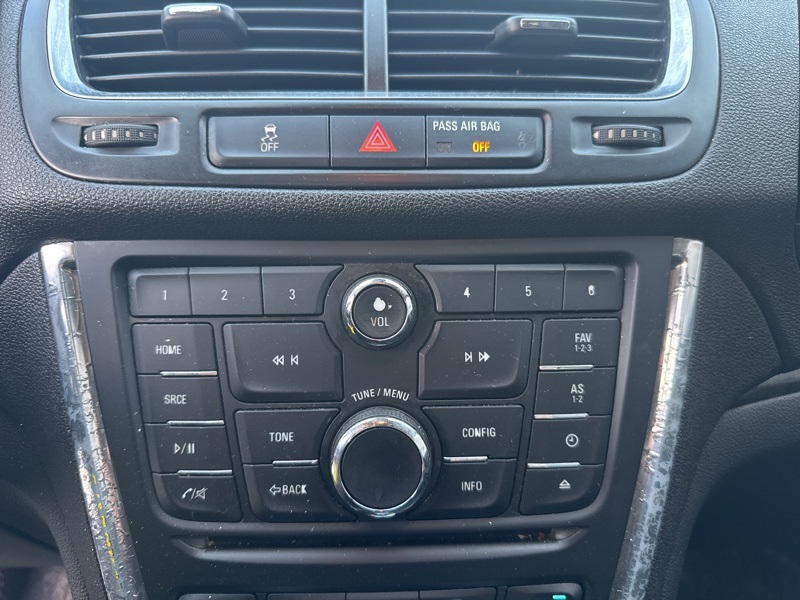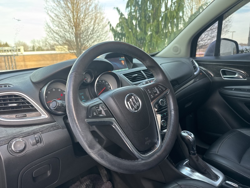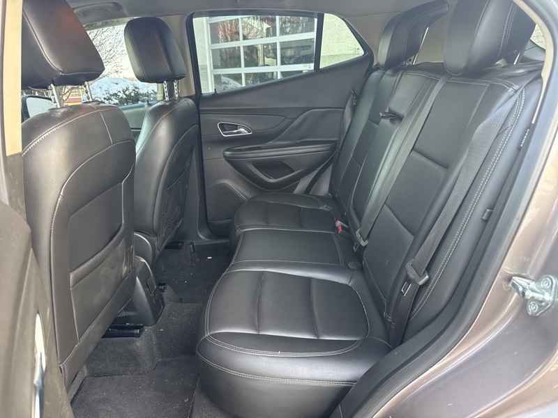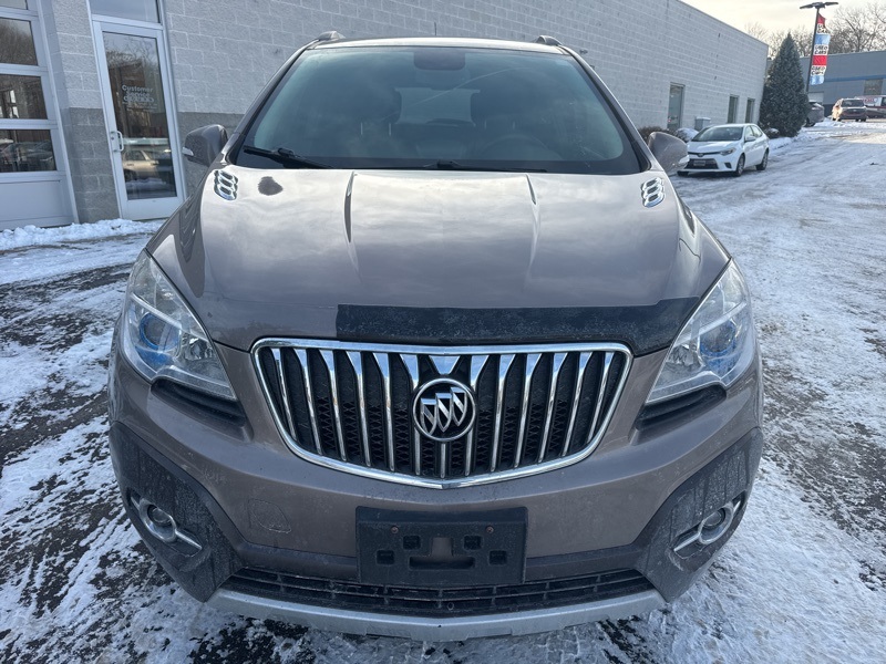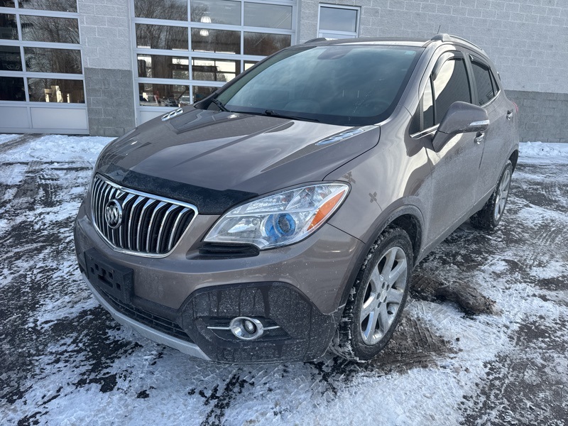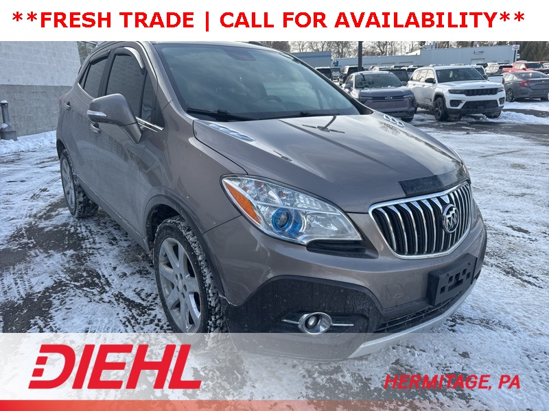 Cocoa Silver Metallic 2014 Buick Encore Leather 4D Sport Utility FWD ECOTEC 1.4L I4 SMPI DOHC Turbocharged VVT 6-Speed Automatic 1SL Equipment Group (120-Volt Power Outlet, Auto-Dimming Inside Rear-View Mirror, Dual-Zone Automatic Climate Control, Front Fog Lamps, and Remote Vehicle Starter System), Encore Leather, Ebony Leather, 18" Chromed Aluminum Wheels, 3.53 Final Drive Ratio, 4-Wheel Disc Brakes, 6 Speakers, ABS brakes, Air Conditioning, Alloy wheels, AM/FM radio: SiriusXM, Auto-dimming Rear-View mirror, Automatic temperature control, Brake assist, Bumpers: body-color, CD player, Compass, Delay-off headlights, Driver door bin, Driver vanity mirror, Driver's Seat Mounted Armrest, Dual front impact airbags, Dual front side impact airbags, Electronic Stability Control, Emergency communication system: OnStar Directions & Connections, Exterior Parking Camera Rear, Front anti-roll bar, Front Bucket Seats, Front dual zone A/C, Front fog lights, Front License Plate Bracket, Front reading lights, Front wheel independent suspension, Fully automatic headlights, Heated door mirrors, Heated Driver & Front Passenger Seats, Heated front seats, Heated steering wheel, Illuminated entry, Knee airbag, Leather steering wheel, Leather-Appointed Seat Trim, Low tire pressure warning, Memory seat, Occupant sensing airbag, Outside temperature display, Overhead airbag, Panic alarm, Passenger door bin, Passenger vanity mirror, Power door mirrors, Power driver seat, Power passenger seat, Power steering, Power Tilt-Sliding Sunroof, Power windows, Premium audio system: IntelliLink, Radio data system, Radio: AM/FM Audio System w/MP3 CD Player, Rear seat center armrest, Rear side impact airbag, Rear window defroster, Rear window wiper, Remote keyless entry, Ride & Handling Suspension, Roof rack: rails only, Security system, SiriusXM Satellite Radio, Speed control, Speed-sensing steering, Split folding rear seat, Spoiler, Steering wheel mounted audio controls, Tachometer, Telescoping steering wheel, Tilt steering wheel, Traction control, Trip computer, Turn signal indicator mirrors, Variably intermittent wipers, and Wheels: 18" Painted Cast Aluminum. 25/33 City/Highway MPG