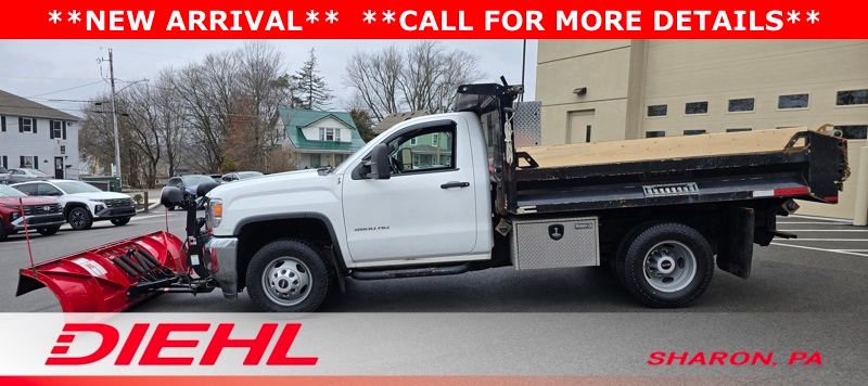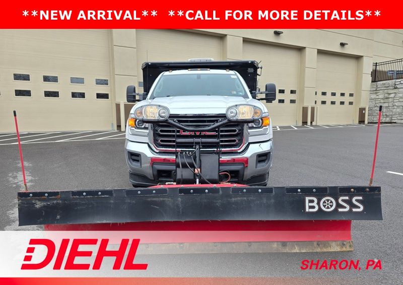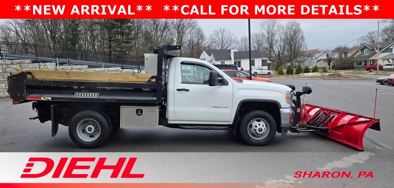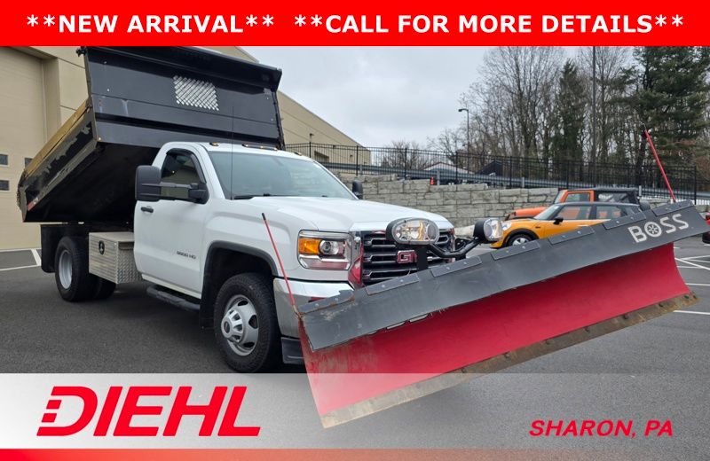 6-Speed Automatic HD Electronic with Overdrive, 4WD, Dark Ash Vinyl, 17" Painted Steel Wheels, 3-Passenger Front 40/20/40 Split Bench Seat, 4 Speakers, 4-Wheel Disc Brakes, ABS brakes, Air Conditioning, AM/FM radio, Brake assist, Bumpers: chrome, Chrome Grille Surround, Cloth Seat Trim, Delay-off headlights, Driver door bin, Dual front impact airbags, Dual rear wheels, Electronic Stability Control, Front anti-roll bar, Front Center Armrest w/Storage, Front reading lights, Front wheel independent suspension, Frontal Passenger-Side Air Bag Deactivation Switch, Fully automatic headlights, Integrated Trailer Brake Controller, Manual Tilt Steering Wheel & Column, Occupant sensing airbag, Overhead console, Passenger cancellable airbag, Passenger door bin, Passenger vanity mirror, Power steering, Preferred Equipment Group 1SA, Provision for Cab Roof-Mounted Lamp/Beacon, Radio: AM/FM Stereo w/4.2" Diagonal Color Display, Sierra Convenience Package, Snow Plow Prep Package, Speed control, Tachometer, Tilt steering wheel, Traction control, Trip computer, Variably intermittent wipers, Voltmeter. Summit White 2015 GMC Sierra 3500HD 4WD 6-Speed Automatic HD Electronic with Overdrive Vortec 6.0L V8 SFI VVT