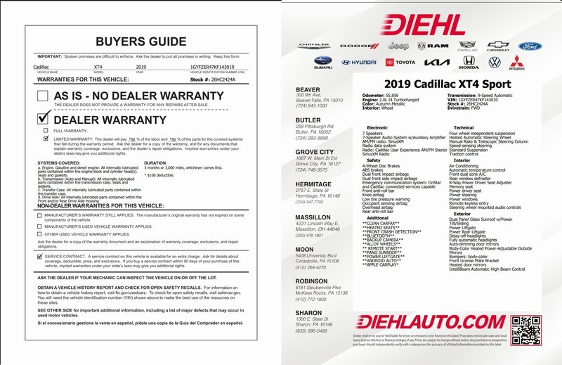 Autumn Metallic 2019 Cadillac XT4 Sport 4D Sport Utility FWD 2.0L I4 Turbocharged 9-Speed Automatic Cold Weather Package (Heated Automatic Steering Wheel, Heated Driver & Front Passenger Seats, and Heated Rear Outboard Seating Positions), Driver Awareness Package (Following Distance Indicator, Forward Collision Alert, Front Pedestrian Braking, IntelliBeam Automatic High Beam Control, Lane Keep Assist w/Lane Departure Warning, and Low Speed Forward Automatic Braking), Preferred Equipment Group 1SF (4.2" Diagonal Color Display Driver Info Center, 6-Way Power Passenger Seat Adjuster, Auto-Dimming Inside Rear-View Mirror, Body-Color Heated Power-Adjustable Outside Mirrors, Electronic Cruise Control w/Set & Resume Speed, Front & Rear Park Assist, HD Rear Vision Camera, Manual Rake & Telescopic Steering Column, and Power Rear Liftgate), XT4 Sport, 2.0L I4 Turbocharged, Autumn Metallic, Wheat Artificial Leather, 4-Wheel Disc Brakes, 7-Speaker Audio System w/Auxiliary Amplifier, 8-Way Power Driver Seat Adjuster, ABS brakes, Automatic temperature control, Dual Panel Glass Sunroof w/Power Tilt/Sliding, Exterior Parking Camera Rear, Front dual zone A/C, Fully automatic headlights, Low tire pressure warning, Memory seat, Power driver seat, Power Liftgate, Radio: Cadillac User Experience AM/FM Stereo, Remote keyless entry, SiriusXM Radio, Steering wheel mounted audio controls, 20" Twin 5-Spoke Alloy Wheels, 3.47 Axle Ratio, 4-Way Driver Seat Power Lumbar Control, 4-Way Passenger Seat Power Lumbar Control, 7 Speakers, Air Conditioning, Alloy wheels, AM/FM radio: SiriusXM, Apple CarPlay/Android Auto, Auto-dimming door mirrors, Auto-dimming Rear-View mirror, Brake assist, Bumpers: body-color, Compass, Delay-off headlights, Driver door bin, Driver vanity mirror, Dual front impact airbags, Dual front side impact airbags, Electronic Stability Control, Emergency communication system: OnStar and Cadillac connected services capable, Four wheel independent suspension, Front & Rear All-Weather Floor Mats, Front anti-roll bar, Front Bucket Seats, Front Center Armrest, Front License Plate Bracket, Front reading lights, Garage door transmitter, Heated door mirrors, Illuminated entry, Knee airbag, Leather Shift Knob, Leather steering wheel, Leatherette Seating Surfaces, Occupant sensing airbag, Outside temperature display, Overhead airbag, Overhead console, Panic alarm, Passenger door bin, Passenger vani