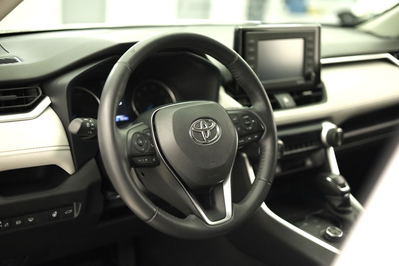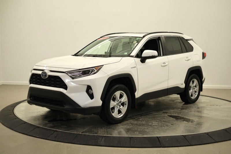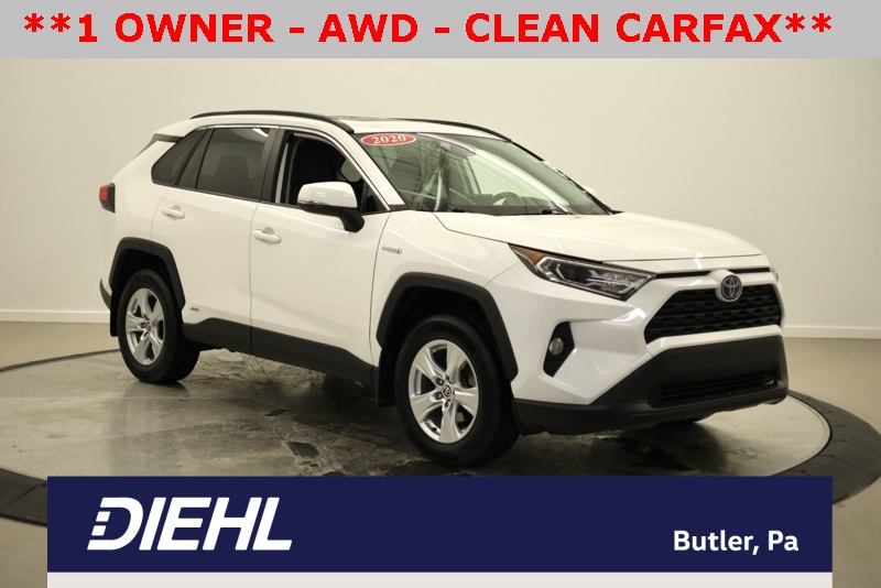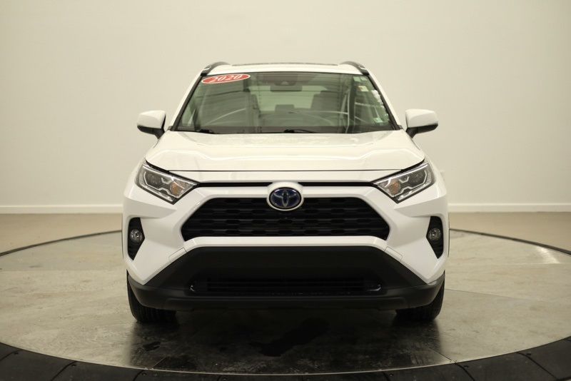 **ALL WHEEL DRIVE**, **BLUETOOTH HANDS FREE PHONE**, **MOONROOF**, **BACK-UP CAMERA**, **CLEAN CARFAX ONE OWNER**, **POWER LIFTGATE**, **APPLE CARPLAY / ANDROID AUTO**, **SMART KEY**, **PRE COLLISION SYSTEM**, **ADAPTIVE CRUISE CONTROL**, **LANE KEEP ASSIST**, **HEATED STEERING WHEEL**, **HEATED FRONT SEATS**, **GREAT SERVICE HISTORY**, 2.5L 4-Cylinder, 4-Wheel Disc Brakes, 6 Speakers, ABS brakes, Air Conditioning, Alloy wheels, AM/FM radio: SiriusXM, AM/FM Stereo, Apple CarPlay/Android Auto, Auto High-beam Headlights, Automatic temperature control, Axle Ratio: TBD, Brake assist, Bumpers: body-color, Convenience Package, Delay-off headlights, Driver door bin, Driver vanity mirror, Dual front impact airbags, Dual front side impact airbags, Electronic Stability Control, Emergency communication system: Safety Connect with 1-year trial, Exterior Parking Camera Rear, Fabric Seat Trim (FA), Four wheel independent suspension, Front anti-roll bar, Front Bucket Seats, Front Center Armrest, Front Door Smart Key System w/Push Button Start, Front dual zone A/C, Front fog lights, Front reading lights, Front Seat Heating, Front Sport Seats, Fully automatic headlights, Heated 3-Spoke Leather Steering Wheel, Heated door mirrors, Illuminated entry, Knee airbag, Low tire pressure warning, Occupant sensing airbag, Outside temperature display, Overhead airbag, Overhead console, Panic alarm, Passenger door bin, Passenger vanity mirror, Power door mirrors, Power driver seat, Power steering, Power windows, Radio data system, Rain Sensing Front Wipers, Rear anti-roll bar, Rear seat center armrest, Rear window defroster, Rear window wiper, Remote keyless entry, Roof rack: rails only, Speed control, Speed-sensing steering, Split folding rear seat, Spoiler, Steering wheel mounted audio controls, Telescoping steering wheel, Tilt & Slide Moon Roof, Tilt steering wheel, Traction control, Trip computer, Turn signal indicator mirrors, Variably intermittent wipers, Wheels: 17" x 7.0J Silver Aluminum Alloy, XLE Grade Weather Package. CARFAX One-Owner. Clean CARFAX. Super White 2020 Toyota RAV4 Hybrid XLE AWD eCVT 2.5L 4-Cylinder