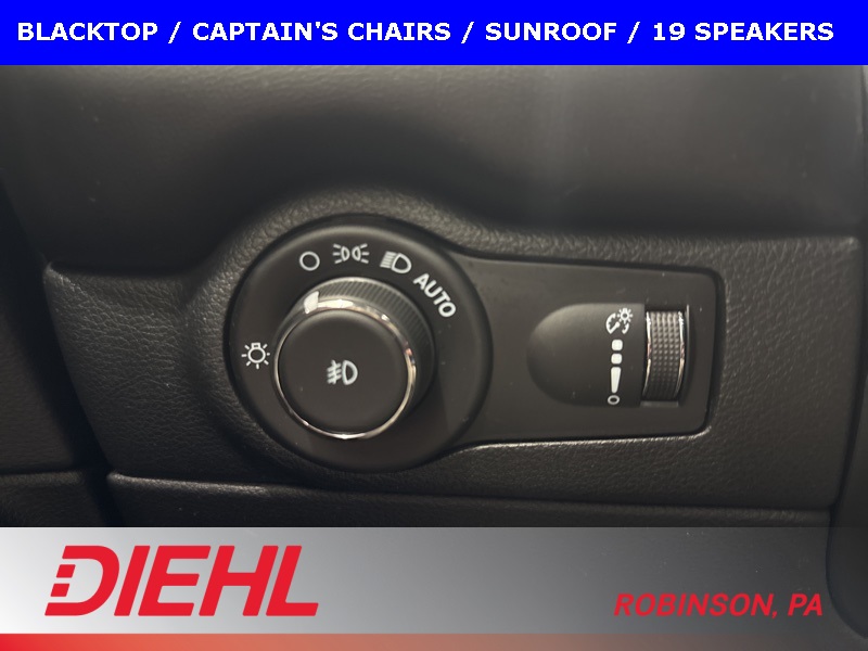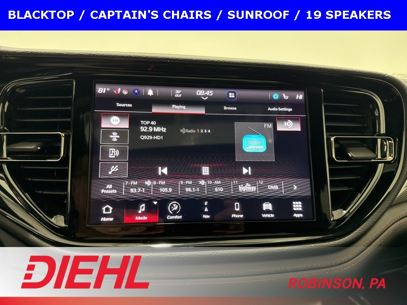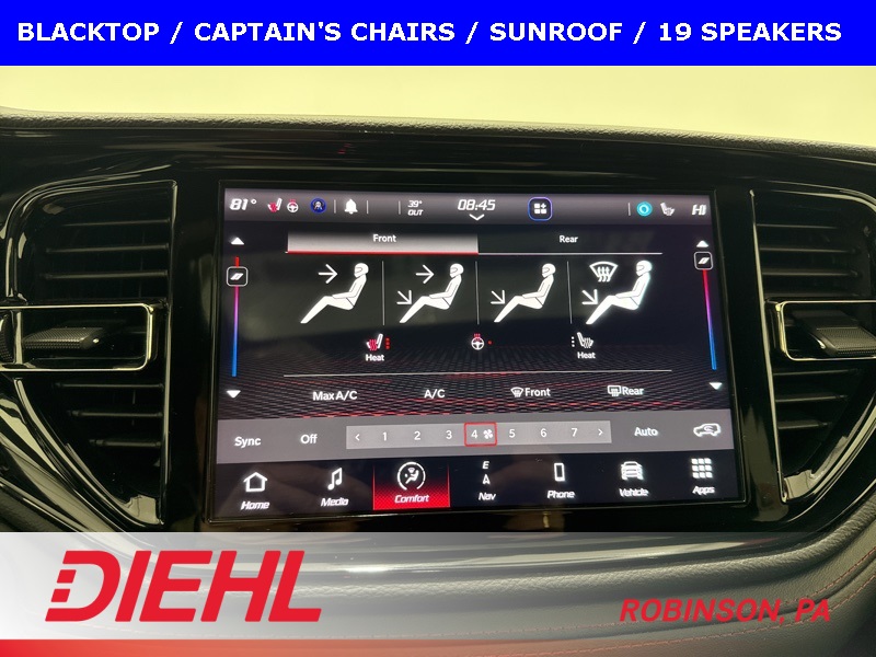 Inside, you’re greeted by leather trimmed bucket seats, an 8 way power driver seat with memory, heated first and second row seats, a heated steering wheel, tri zone climate control, remote start, and the kind of comfort that makes you forget the outside world exists. The 10.1 inch Uconnect touchscreen with navigation, Apple CarPlay, Android Auto, SiriusXM, and premium audio keeps you connected, entertained, and feeling like the captain of a very fast, very well equipped ship.