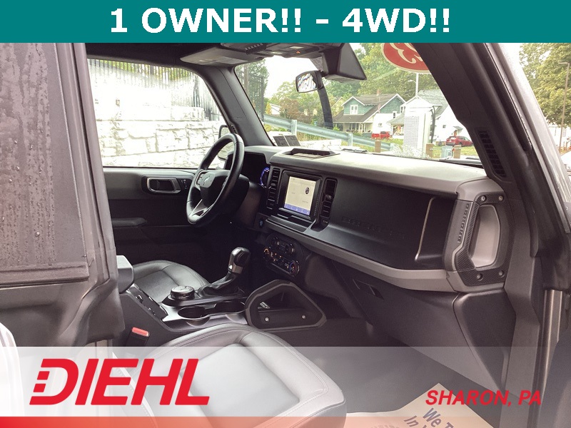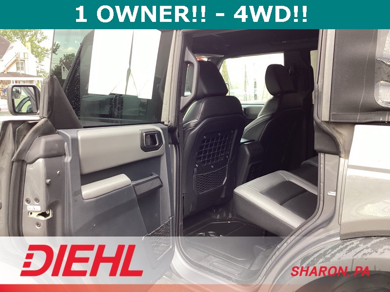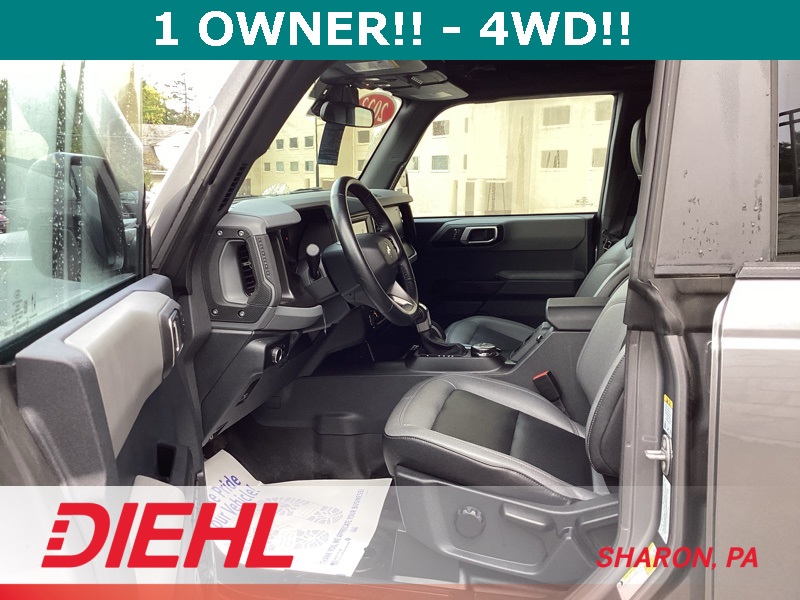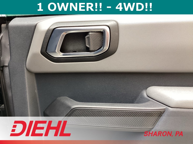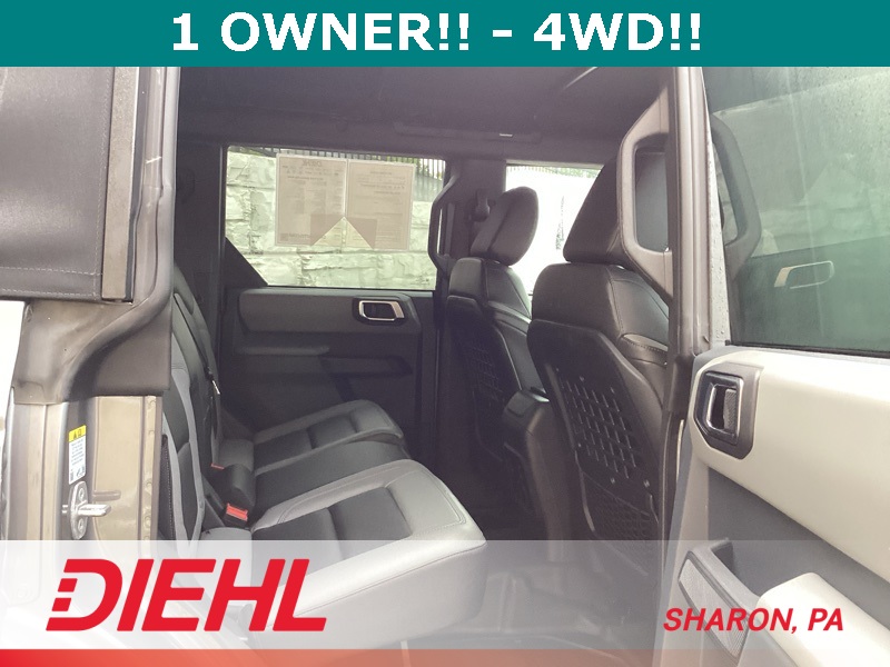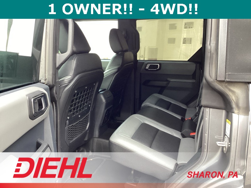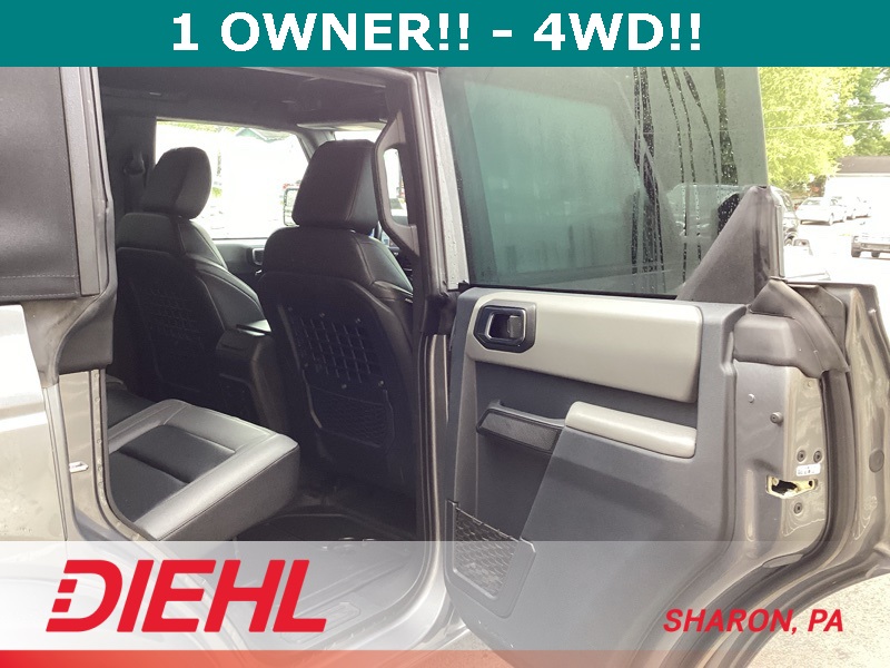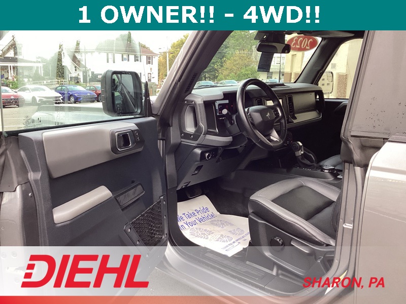 **ONE-OWNER**, **BACKUP CAMERA**, **POWER DRIVERS SEAT**, **APPLE CAR PLAY**, **ANDROID AUTO**, 4-Wheel Disc Brakes, 7 Speakers, ABS brakes, Air Conditioning, AM/FM radio: SiriusXM with 360L, AM/FM Stereo, Auto High-beam Headlights, Brake assist, Compass, Delay-off headlights, Driver door bin, Driver vanity mirror, Dual front impact airbags, Dual front side impact airbags, Electronic Stability Control, Emergency communication system: 911 Assist, Exterior Parking Camera Rear, Ford Performance Heavy-Duty Modular Front Bumper, Front anti-roll bar, Front Bucket Seats, Front Center Armrest, Front reading lights, Front wheel independent suspension, Fully automatic headlights, Heated door mirrors, Illuminated entry, Integrated roll-over protection, Low tire pressure warning, Occupant sensing airbag, Outside temperature display, Overhead airbag, Overhead console, Panic alarm, Passenger door bin, Passenger vanity mirror, Power door mirrors, Power steering, Power windows, Radio data system, Remote keyless entry, Security system, SiriusXM Radio w/360L, Speed control, Split folding rear seat, Steering wheel mounted audio controls, SYNC 4, Tachometer, Telescoping steering wheel, Tilt steering wheel, Traction control, Trip computer, Variably intermittent wipers. Carbonized Gray Metallic 2023 Ford Bronco 4WD 10-Speed Automatic 2.3L EcoBoost I-4