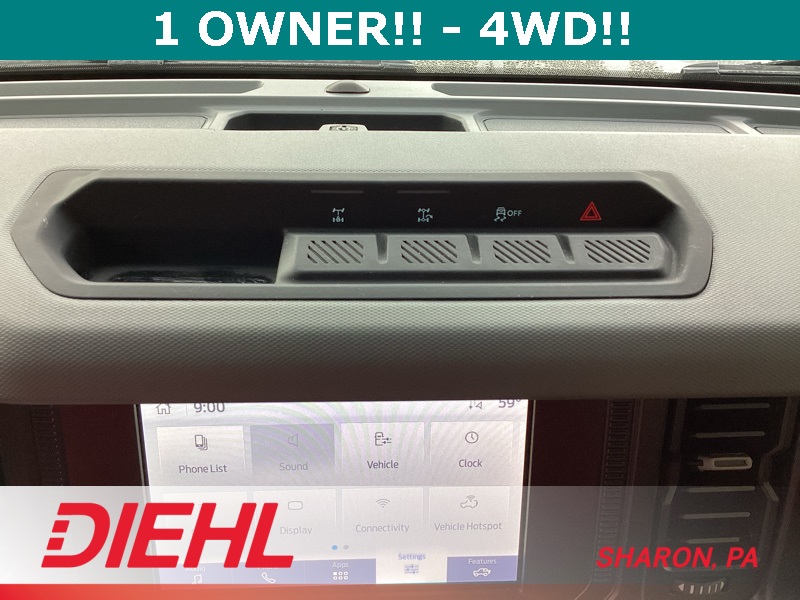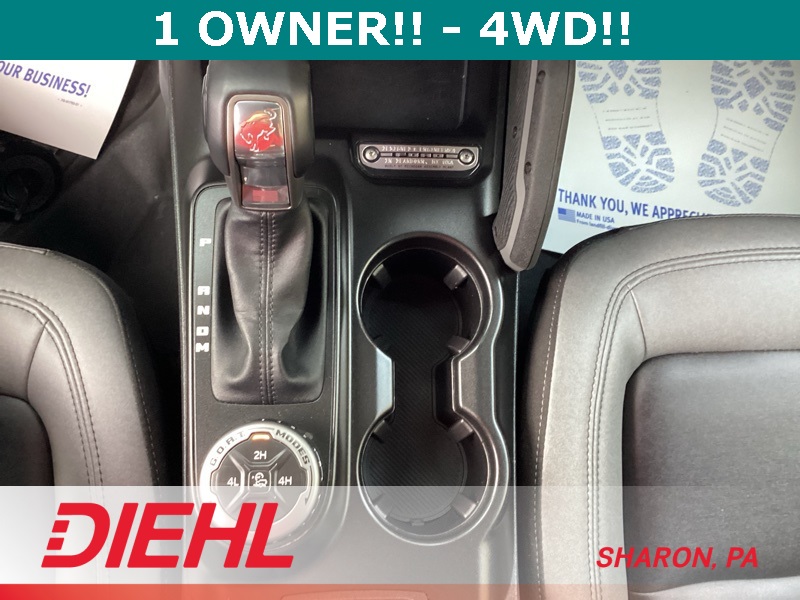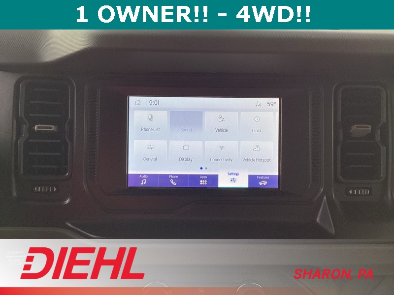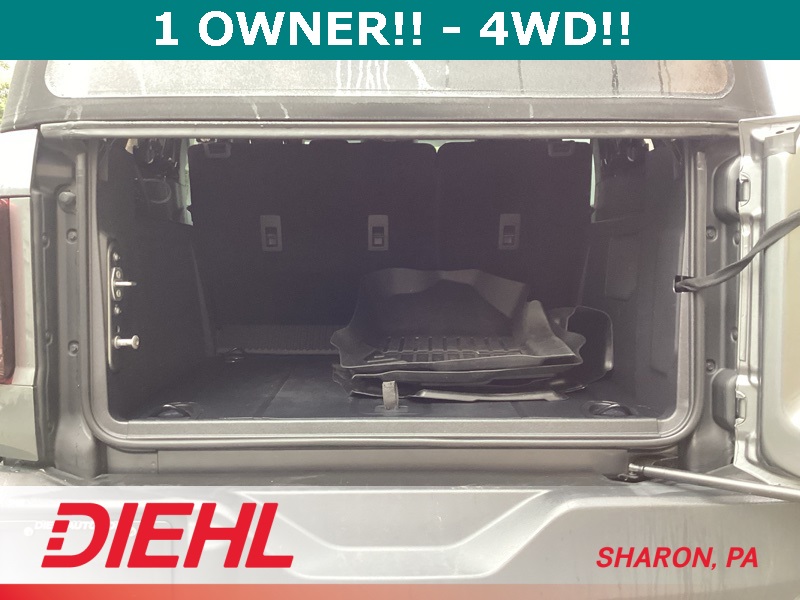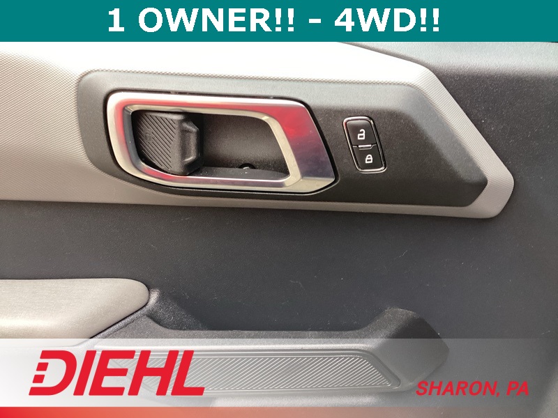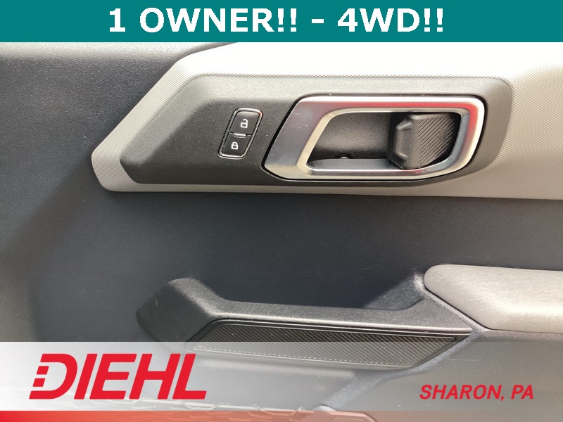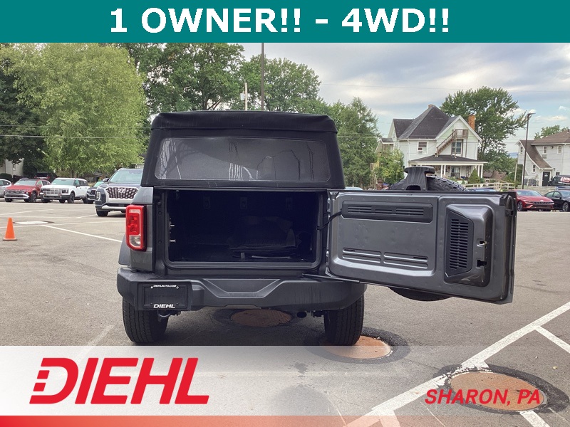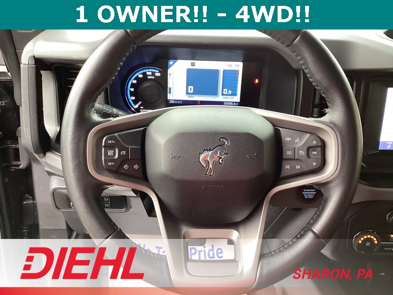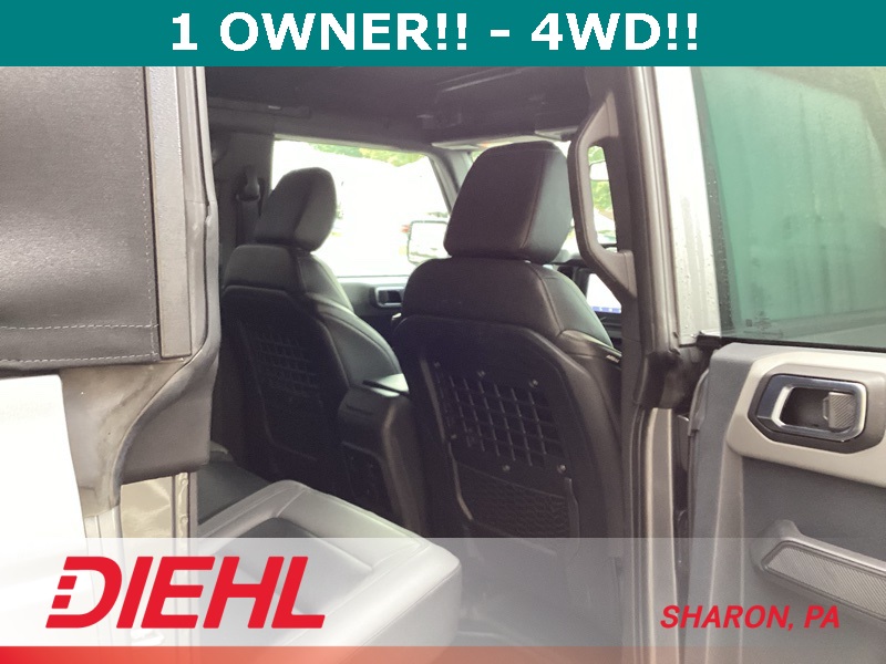 **ONE-OWNER**, **BACKUP CAMERA**, **POWER DRIVERS SEAT**, **APPLE CAR PLAY**, **ANDROID AUTO**, 4-Wheel Disc Brakes, 7 Speakers, ABS brakes, Air Conditioning, AM/FM radio: SiriusXM with 360L, AM/FM Stereo, Auto High-beam Headlights, Brake assist, Compass, Delay-off headlights, Driver door bin, Driver vanity mirror, Dual front impact airbags, Dual front side impact airbags, Electronic Stability Control, Emergency communication system: 911 Assist, Exterior Parking Camera Rear, Ford Performance Heavy-Duty Modular Front Bumper, Front anti-roll bar, Front Bucket Seats, Front Center Armrest, Front reading lights, Front wheel independent suspension, Fully automatic headlights, Heated door mirrors, Illuminated entry, Integrated roll-over protection, Low tire pressure warning, Occupant sensing airbag, Outside temperature display, Overhead airbag, Overhead console, Panic alarm, Passenger door bin, Passenger vanity mirror, Power door mirrors, Power steering, Power windows, Radio data system, Remote keyless entry, Security system, SiriusXM Radio w/360L, Speed control, Split folding rear seat, Steering wheel mounted audio controls, SYNC 4, Tachometer, Telescoping steering wheel, Tilt steering wheel, Traction control, Trip computer, Variably intermittent wipers. Carbonized Gray Metallic 2023 Ford Bronco 4WD 10-Speed Automatic 2.3L EcoBoost I-4
