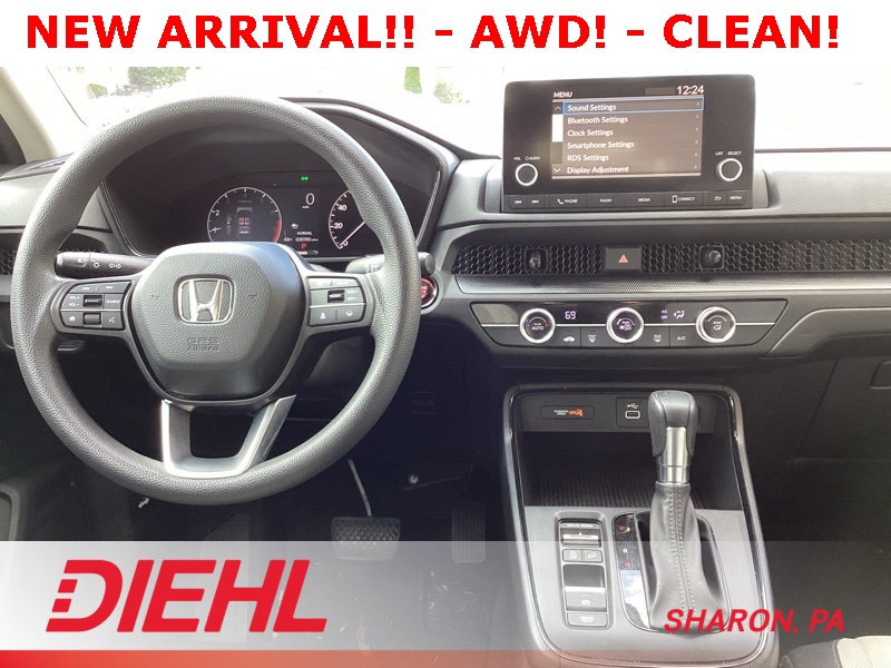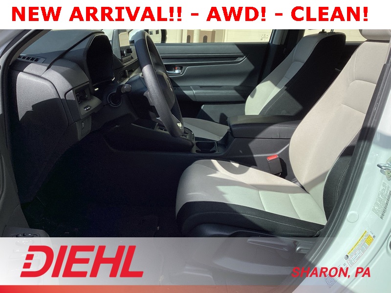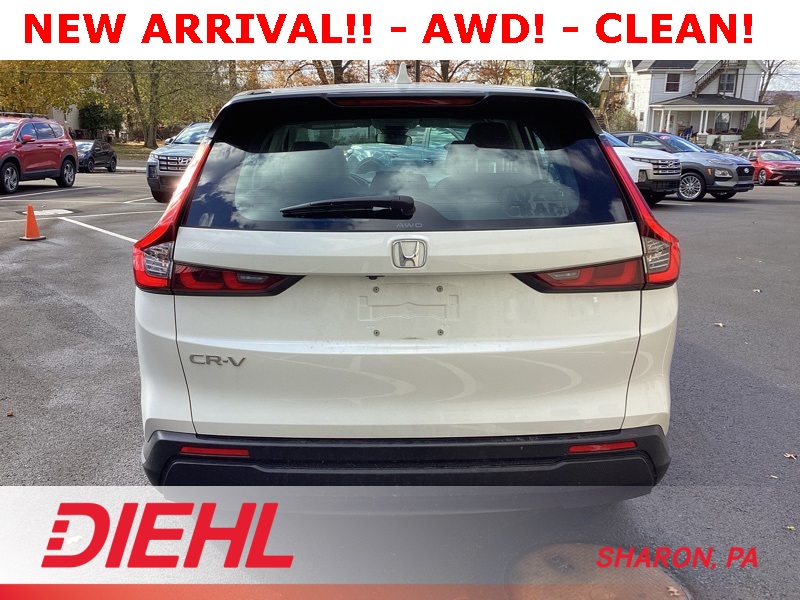 AWD, 4 Speakers, 4-Wheel Disc Brakes, 5.64 Axle Ratio, ABS brakes, Adaptive Cruise Control: Adaptive Cruise Control (ACC) with Low-Speed Follow, Air Conditioning, Apple CarPlay/Android Auto, Auto High-beam Headlights, Automatic temperature control, Brake assist, Bumpers: body-color, Cloth Seat Trim, Compass, Delay-off headlights, Driver door bin, Driver vanity mirror, Dual front impact airbags, Dual front side impact airbags, Electronic Stability Control, Exterior Parking Camera Rear, Four wheel independent suspension, Front anti-roll bar, Front Bucket Seats, Front Center Armrest, Front reading lights, Fully automatic headlights, Illuminated entry, Knee airbag, Low tire pressure warning, Occupant sensing airbag, Outside temperature display, Overhead airbag, Overhead console, Panic alarm, Passenger door bin, Passenger vanity mirror, Power door mirrors, Power steering, Power windows, Radio data system, Radio: 160-Watt AM/FM Audio System, Rear anti-roll bar, Rear reading lights, Rear seat center armrest, Rear side impact airbag, Rear window defroster, Rear window wiper, Remote keyless entry, Security system, Speed control, Speed-sensing steering, Speed-Sensitive Wipers, Split folding rear seat, Spoiler, Steering wheel mounted audio controls, Tachometer, Telescoping steering wheel, Tilt steering wheel, Traction control, Trip computer, Turn signal indicator mirrors, Variably intermittent wipers, Wheels: 17" Steel w/Covers. White 2023 Honda CR-V LX AWD CVT 1.5L I4 DOHC 16V