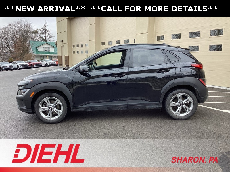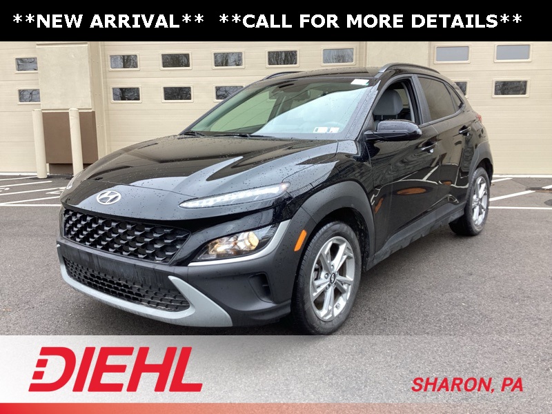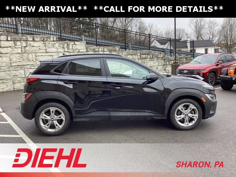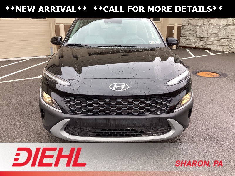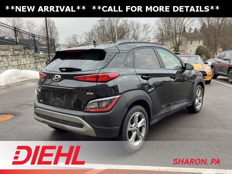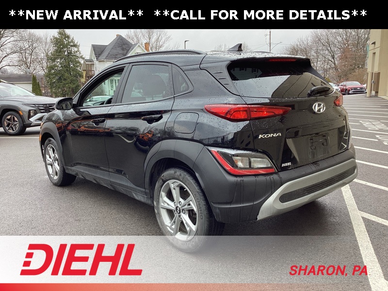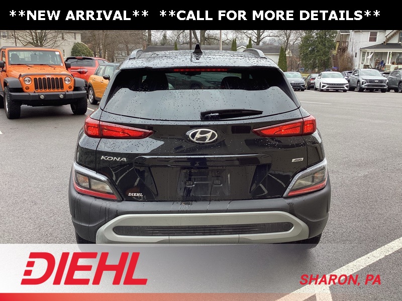 17" x 7.0J Alloy Wheels, 4-Wheel Disc Brakes, 5.715 Axle Ratio, 6 Speakers, ABS brakes, Air Conditioning, Alloy wheels, AM/FM radio: SiriusXM, Apple CarPlay & Android Auto, Brake assist, Bumpers: body-color, Cargo Blocks, Cargo Net, Cargo Package, Cargo Tray, Carpeted Floor Mats, Cloth Seat Trim, Delay-off headlights, Driver door bin, Driver vanity mirror, Dual front impact airbags, Dual front side impact airbags, Electronic Stability Control, Emergency communication system: Blue Link Connected Car Service (3-year complimentary subscription), Exterior Parking Camera Rear, First Aid Kit, Four wheel independent suspension, Front anti-roll bar, Front Bucket Seats, Front Center Armrest, Front reading lights, Fully automatic headlights, Heated door mirrors, Illuminated entry, Low tire pressure warning, Occupant sensing airbag, Option Group 01, Outside temperature display, Overhead airbag, Overhead console, Panic alarm, Passenger door bin, Passenger vanity mirror, Power door mirrors, Power driver seat, Power steering, Power windows, Radio: AM/FM/HD/SiriusXM Audio System, Rear anti-roll bar, Rear seat center armrest, Rear window defroster, Rear window wiper, Remote keyless entry, Security system, Speed control, Speed-sensing steering, Split folding rear seat, Spoiler, Steering wheel mounted audio controls, Tachometer, Telescoping steering wheel, Tilt steering wheel, Traction control, Trip computer, Turn signal indicator mirrors, Variably intermittent wipers, Wheel Locks. Certified. Abyss Black Pearl 2023 Hyundai Kona SEL AWD CVT 2.0L I4 DOHC Dual CVVT