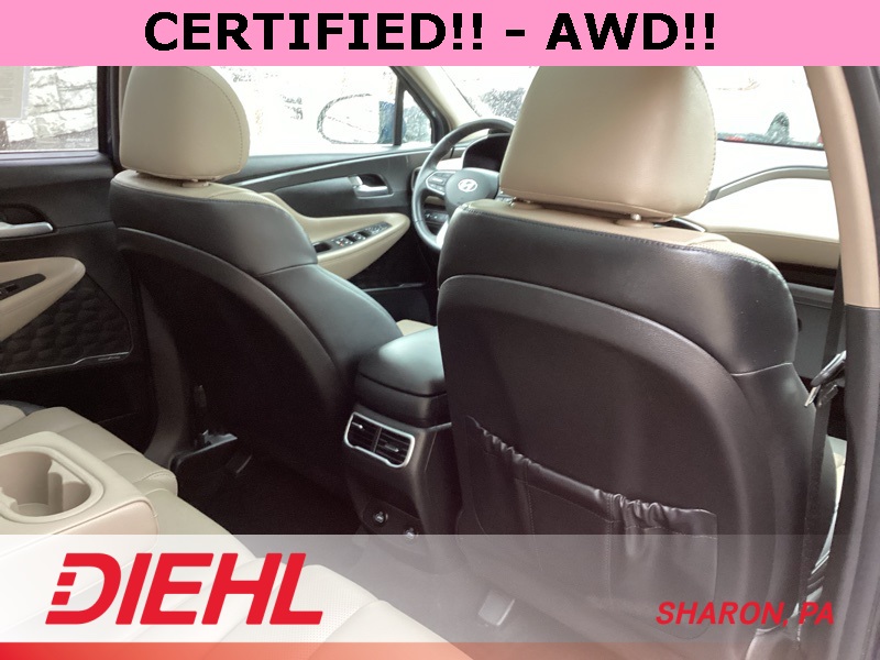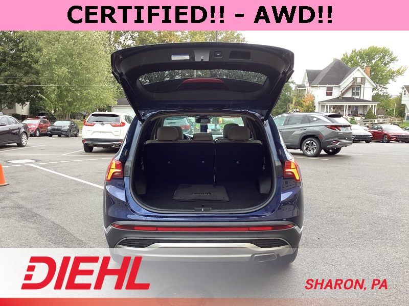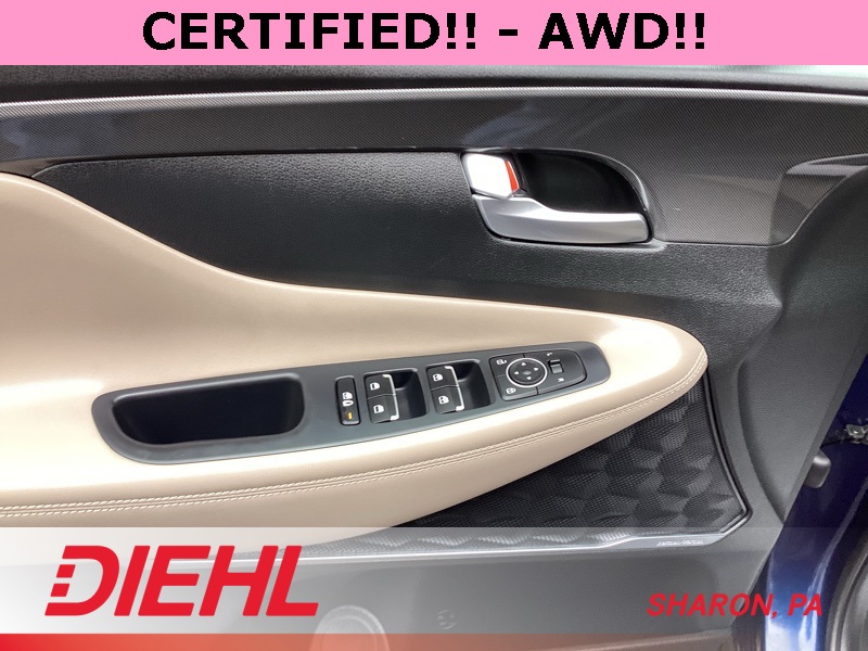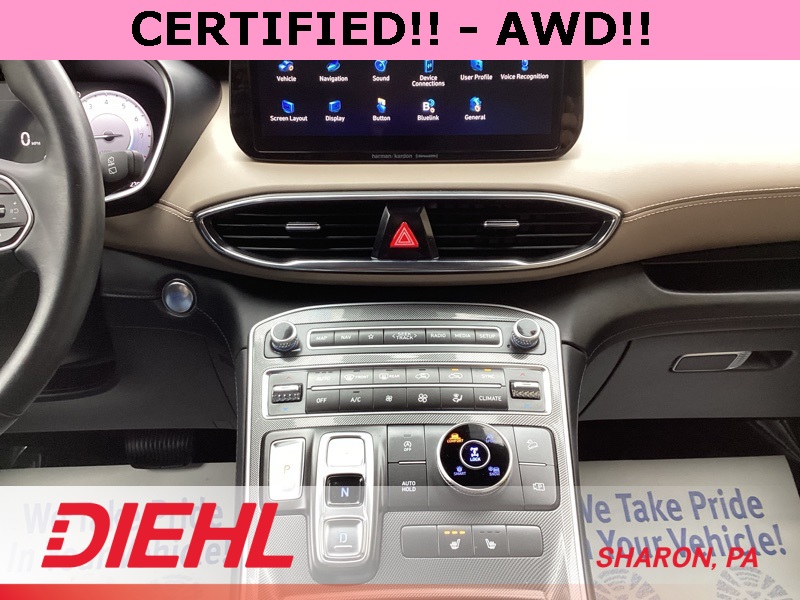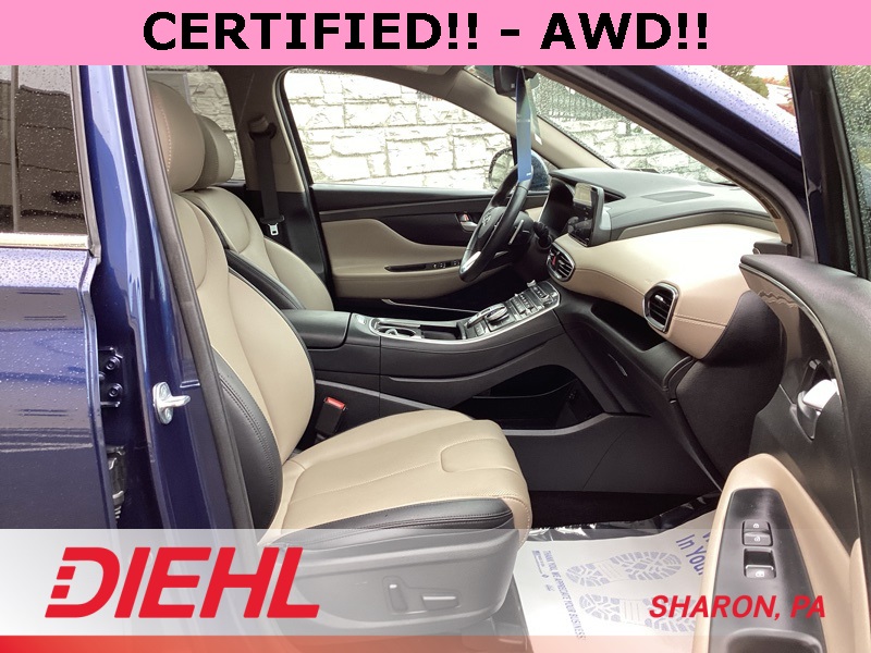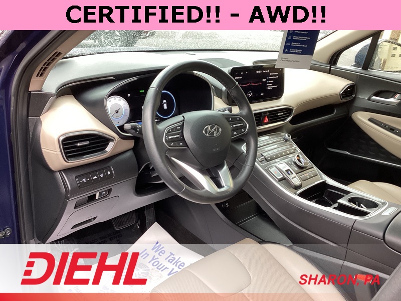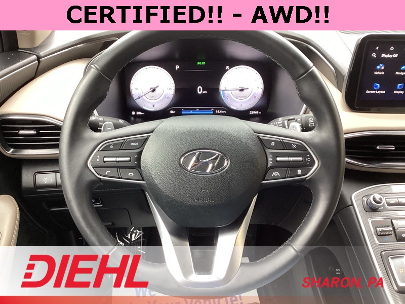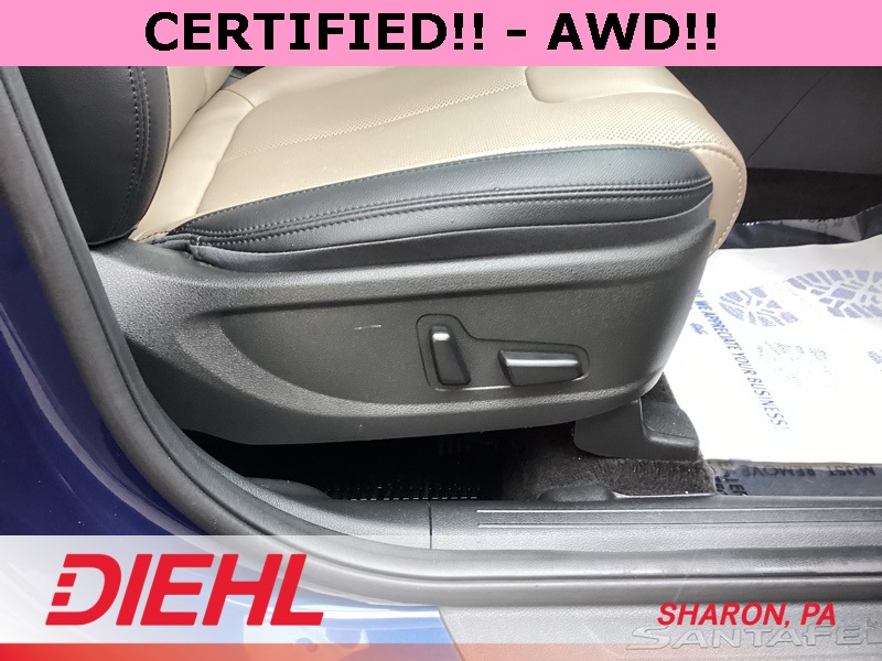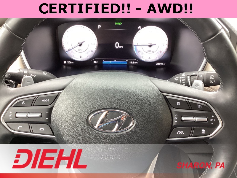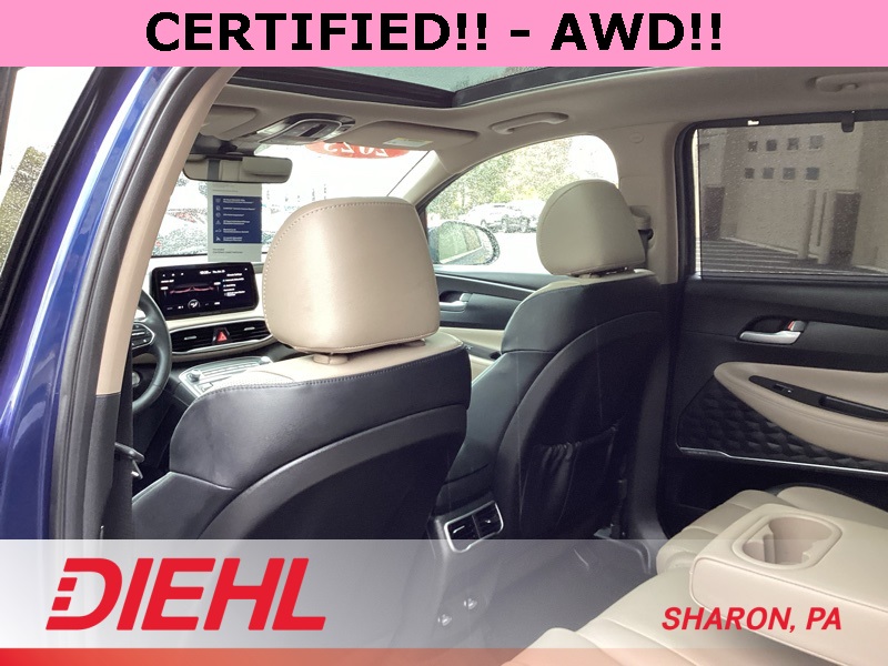 **APPLE CAR PLAY**, **ANDROID AUTO**, **CERTIFIED PRE OWNED**, AWD, Beige Artificial Leather, 12.3" LCD Multi-Information Display, 18" x 7.5J Alloy Wheels, 4-Wheel Disc Brakes, 6 Speakers, 8-Way Power Passenger Seat, ABS brakes, Acoustic-Laminated Front Side Windows, Air Conditioning, Alloy wheels, AM/FM radio: SiriusXM, Apple CarPlay & Android Auto, Auto High-beam Headlights, Auto-Dimming Rear-View Mirror, Automatic temperature control, Axle Ratio: 4.081, Blind-Spot View Monitor, Brake assist, Bumper Applique, Bumpers: body-color, Cargo Net, Carpeted Floor Mats, Chrome Front & Rear Bumper Accents, Chrome Interior Accents, Delay-off headlights, Driver door bin, Driver vanity mirror, Dual front impact airbags, Dual front side impact airbags, Electronic Stability Control, Emergency communication system, Exterior Parking Camera Rear, First Aid Kit, Four wheel independent suspension, Front anti-roll bar, Front Bucket Seats, Front Center Armrest, Front dual zone A/C, Front reading lights, Fully automatic headlights, H-Tex Leatherette Seat Trim, harman/kardon® Audio System, Heated door mirrors, Heated Front Bucket Seats, Heated front seats, Illuminated entry, Leather steering wheel, LED Interior Lights, LED Taillights, Low tire pressure warning, Manual Rear Side Sunshades, Navigation System, Occupant sensing airbag, Option Group 02, Outside temperature display, Overhead airbag, Overhead console, Panic alarm, Panoramic Sunroof, Passenger door bin, Passenger vanity mirror, Power door mirrors, Power driver seat, Power Liftgate, Power Release 2nd Row Seats, Power steering, Power windows, Premium Package, Radio: AM/FM Display Audio, Rear anti-roll bar, Rear seat center armrest, Rear window defroster, Rear window wiper, Remote keyless entry, Roof Rack Cross Bars (DISC), Security system, Silver Front Grille, Speed control, Speed-sensing steering, Split folding rear seat, Spoiler, Stain-Resistant Cloth Seat Trim, Steering wheel mounted audio controls, Surround View Monitor, Tachometer, Telescoping steering wheel, Tilt steering wheel, Traction control, Trip computer, Turn signal indicator mirrors, Variably intermittent wipers. Certified. Stormy Sea 2023 Hyundai Santa Fe SEL AWD 8-Speed Automatic with SHIFTRONIC 2.5L I4