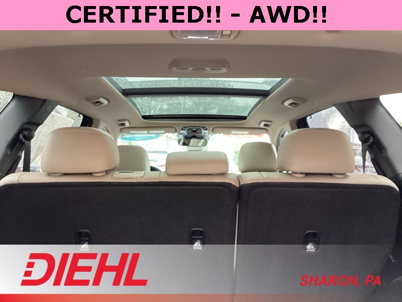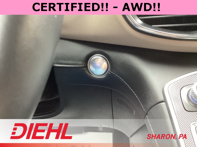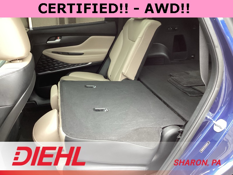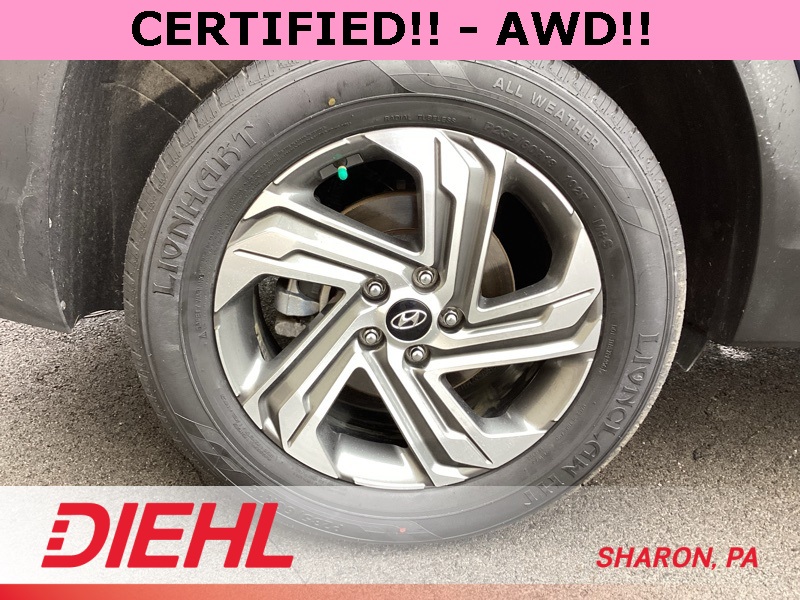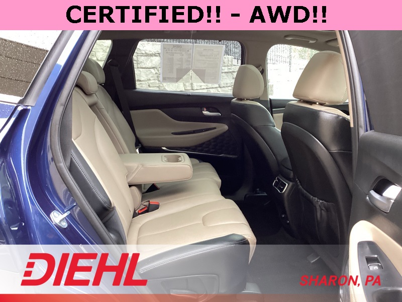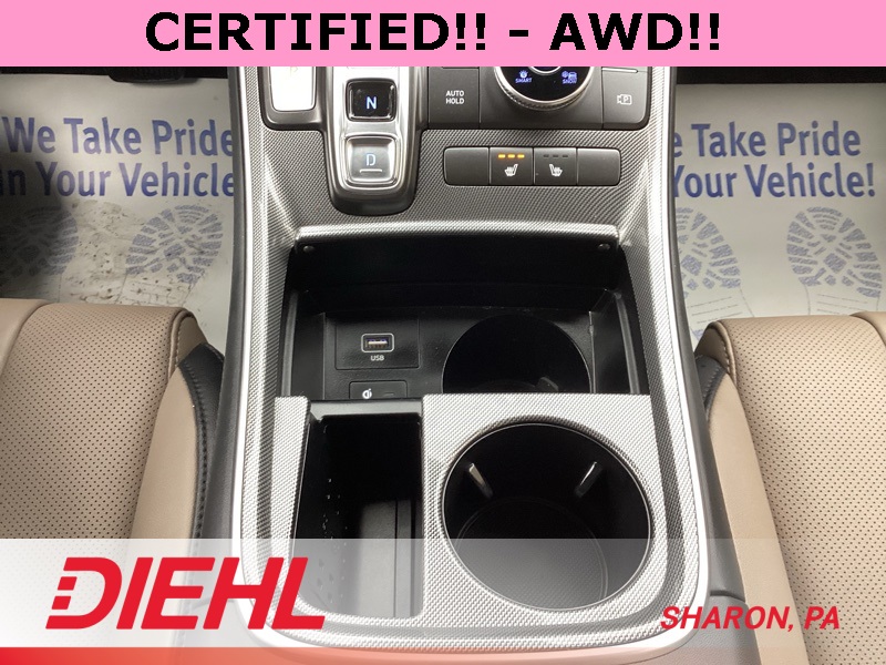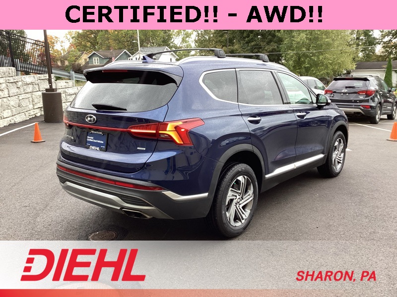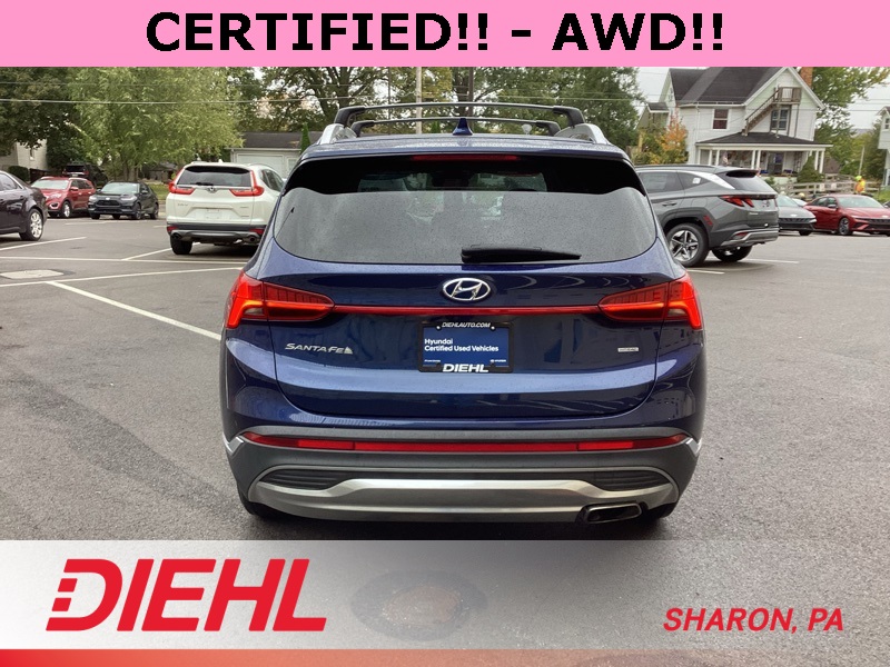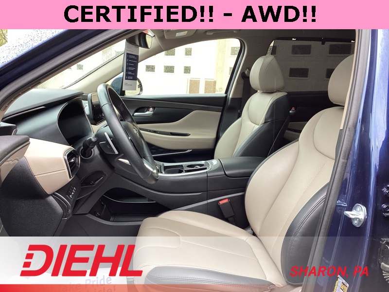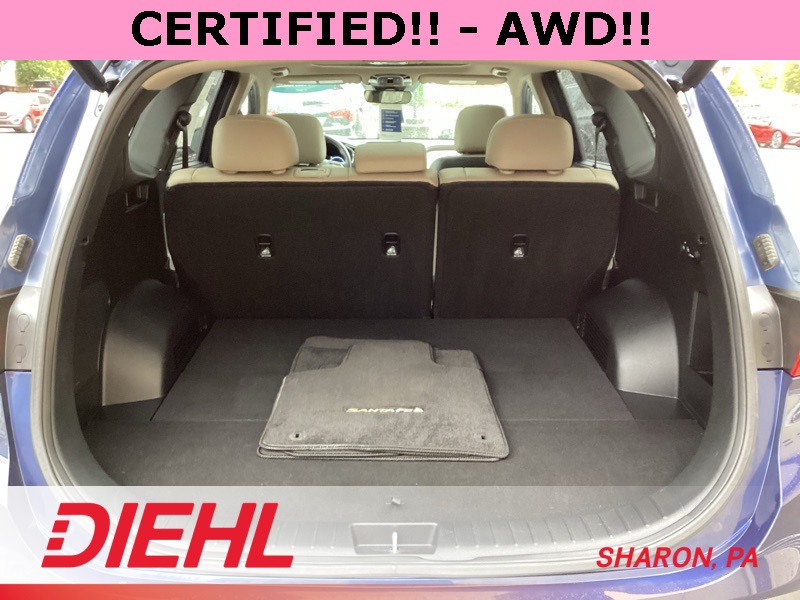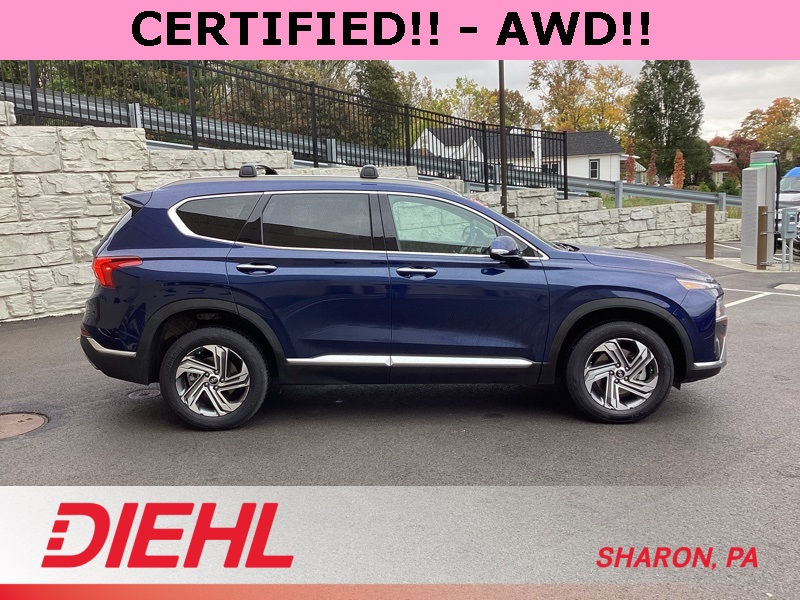 **APPLE CAR PLAY**, **ANDROID AUTO**, **CERTIFIED PRE OWNED**, AWD, Beige Artificial Leather, 12.3" LCD Multi-Information Display, 18" x 7.5J Alloy Wheels, 4-Wheel Disc Brakes, 6 Speakers, 8-Way Power Passenger Seat, ABS brakes, Acoustic-Laminated Front Side Windows, Air Conditioning, Alloy wheels, AM/FM radio: SiriusXM, Apple CarPlay & Android Auto, Auto High-beam Headlights, Auto-Dimming Rear-View Mirror, Automatic temperature control, Axle Ratio: 4.081, Blind-Spot View Monitor, Brake assist, Bumper Applique, Bumpers: body-color, Cargo Net, Carpeted Floor Mats, Chrome Front & Rear Bumper Accents, Chrome Interior Accents, Delay-off headlights, Driver door bin, Driver vanity mirror, Dual front impact airbags, Dual front side impact airbags, Electronic Stability Control, Emergency communication system, Exterior Parking Camera Rear, First Aid Kit, Four wheel independent suspension, Front anti-roll bar, Front Bucket Seats, Front Center Armrest, Front dual zone A/C, Front reading lights, Fully automatic headlights, H-Tex Leatherette Seat Trim, harman/kardon® Audio System, Heated door mirrors, Heated Front Bucket Seats, Heated front seats, Illuminated entry, Leather steering wheel, LED Interior Lights, LED Taillights, Low tire pressure warning, Manual Rear Side Sunshades, Navigation System, Occupant sensing airbag, Option Group 02, Outside temperature display, Overhead airbag, Overhead console, Panic alarm, Panoramic Sunroof, Passenger door bin, Passenger vanity mirror, Power door mirrors, Power driver seat, Power Liftgate, Power Release 2nd Row Seats, Power steering, Power windows, Premium Package, Radio: AM/FM Display Audio, Rear anti-roll bar, Rear seat center armrest, Rear window defroster, Rear window wiper, Remote keyless entry, Roof Rack Cross Bars (DISC), Security system, Silver Front Grille, Speed control, Speed-sensing steering, Split folding rear seat, Spoiler, Stain-Resistant Cloth Seat Trim, Steering wheel mounted audio controls, Surround View Monitor, Tachometer, Telescoping steering wheel, Tilt steering wheel, Traction control, Trip computer, Turn signal indicator mirrors, Variably intermittent wipers. Certified. Stormy Sea 2023 Hyundai Santa Fe SEL AWD 8-Speed Automatic with SHIFTRONIC 2.5L I4