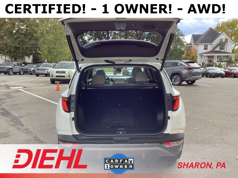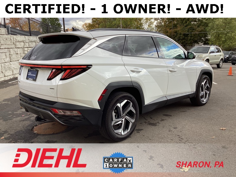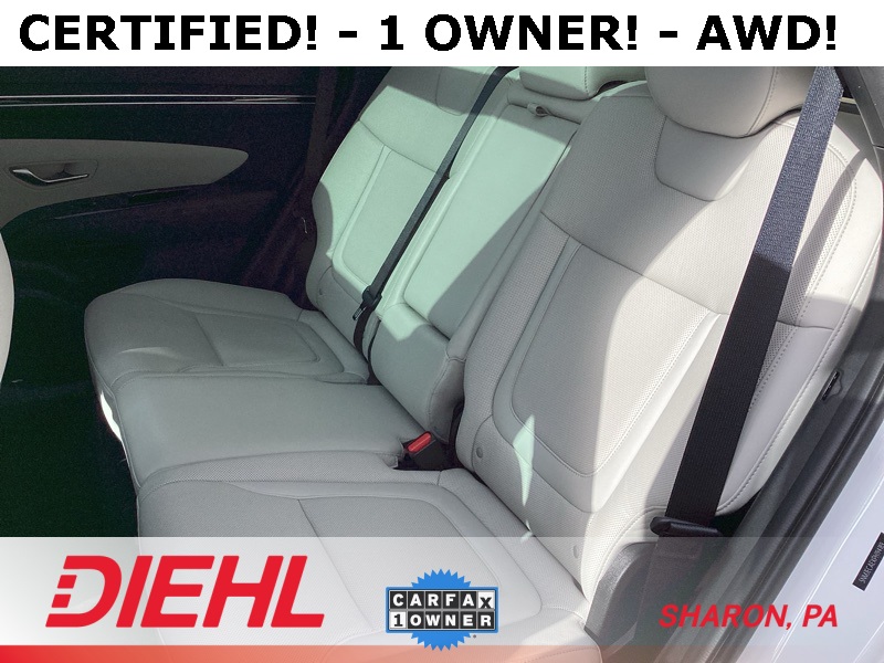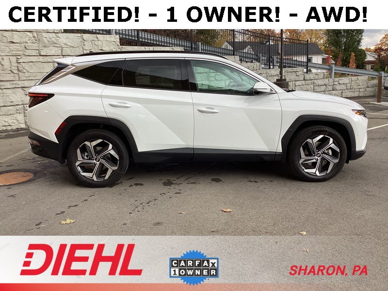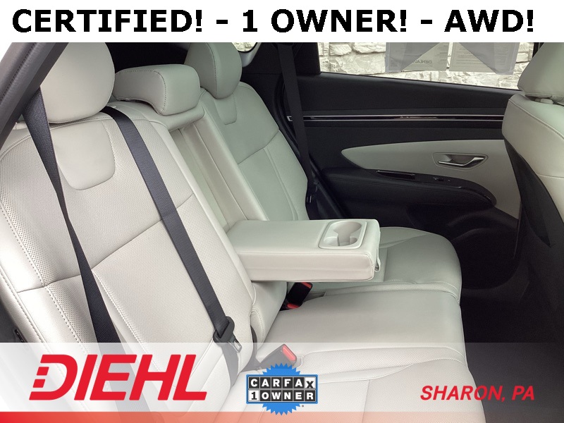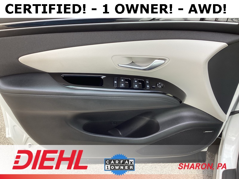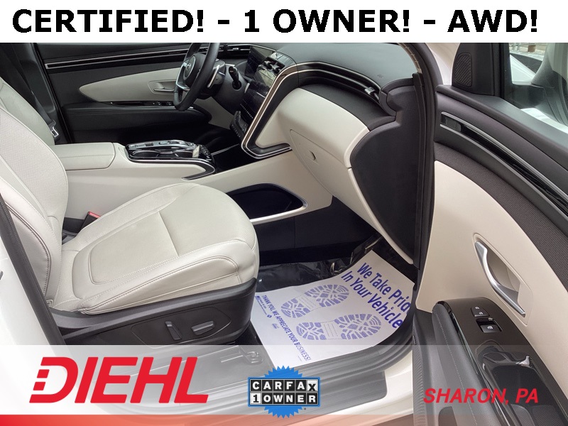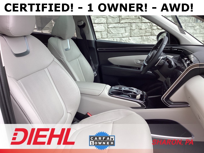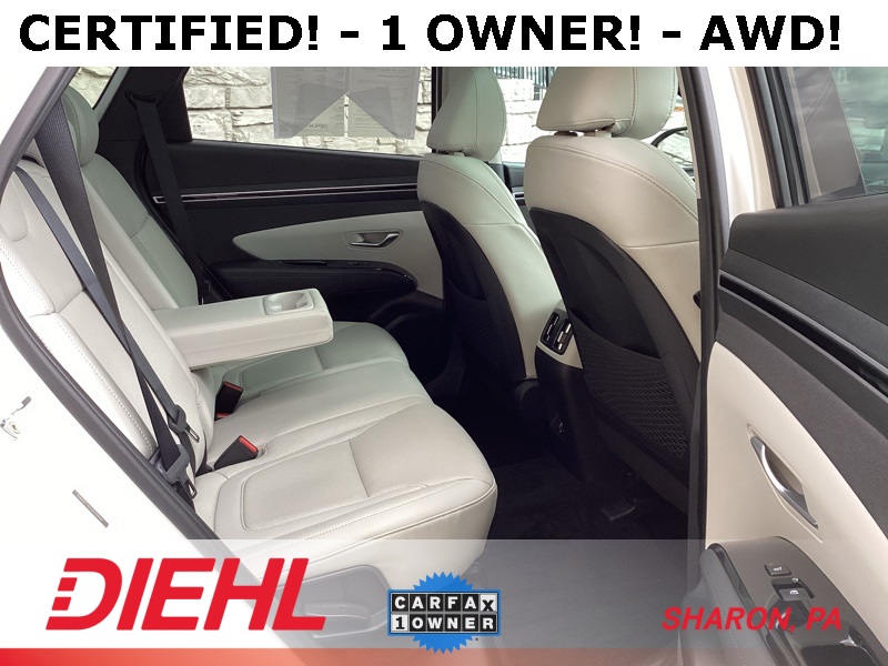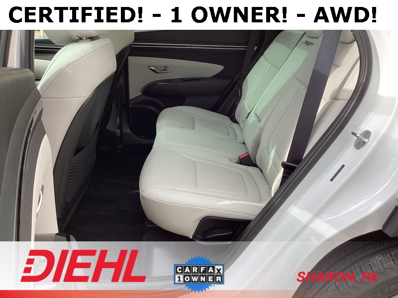 **ONE-OWNER**, **APPLE CAR PLAY**, **ANDROID AUTO**, **CERTIFIED PRE OWNED**, AWD, 3.648 Axle Ratio, 4-Wheel Disc Brakes, 8 Speakers, ABS brakes, Air Conditioning, Alloy wheels, AM/FM radio: SiriusXM, Apple CarPlay & Android Auto, Auto High-beam Headlights, Auto-dimming Rear-View mirror, Automatic temperature control, Brake assist, Bumpers: body-color, Cargo Tray, Carpeted Floor Mats, Delay-off headlights, Driver door bin, Driver vanity mirror, Dual front impact airbags, Dual front side impact airbags, Electronic Stability Control, Emergency communication system: Blue Link Connected Car Service (3-year complimentary subscription), Four wheel independent suspension, Front anti-roll bar, Front Bucket Seats, Front Center Armrest, Front dual zone A/C, Front reading lights, Fully automatic headlights, Garage door transmitter: HomeLink, Heated & Ventilated Front Bucket Seats, Heated door mirrors, Heated front seats, Heated rear seats, Heated steering wheel, Illuminated entry, Leather Seat Trim, Low tire pressure warning, Memory seat, Navigation System, Occupant sensing airbag, Option Group 01, Outside temperature display, Overhead airbag, Overhead console, Panic alarm, Passenger door bin, Passenger vanity mirror, Power door mirrors, Power driver seat, Power Liftgate, Power moonroof, Power passenger seat, Power steering, Power windows, Radio data system, Radio: Bose Premium w/AM/FM/HD/SiriusXM Audio System, Rain sensing wipers, Rear anti-roll bar, Rear reading lights, Rear seat center armrest, Rear window defroster, Rear window wiper, Remote keyless entry, Roof rack: rails only, Security system, Speed control, Split folding rear seat, Spoiler, Steering wheel mounted audio controls, Tachometer, Telescoping steering wheel, Tilt steering wheel, Tow Hitch, Traction control, Trip computer, Turn signal indicator mirrors, Variably intermittent wipers, Ventilated front seats, Wheels: 19" x 7.5J" Machine-Face Finish Alloy. Certified. Serenity White Pearl 2023 Hyundai Tucson Limited AWD 8-Speed Automatic with SHIFTRONIC 2.5L I4 DGI DOHC 16V LEV3-ULEV70 187hp