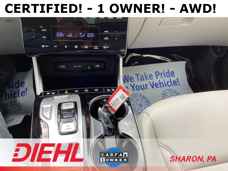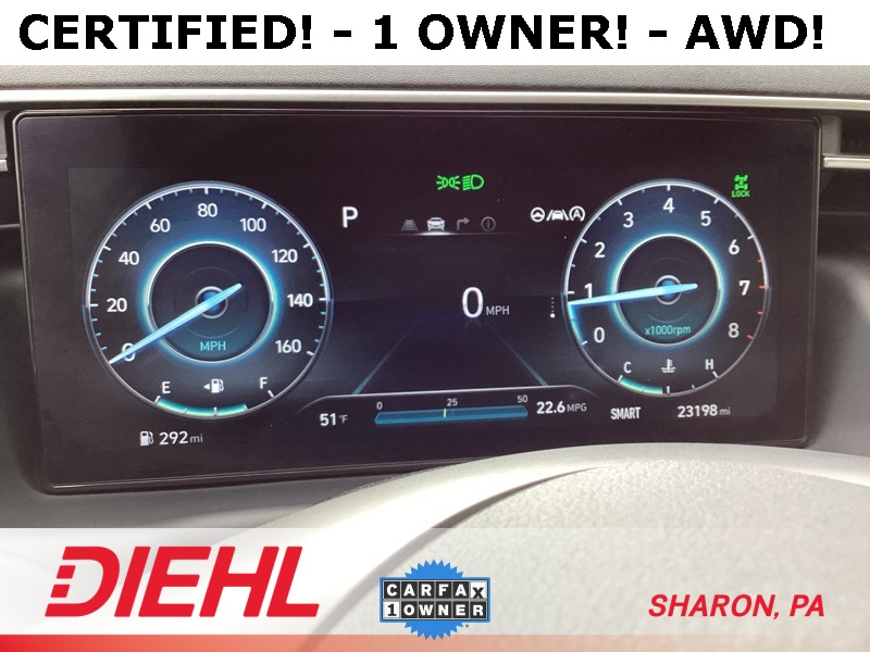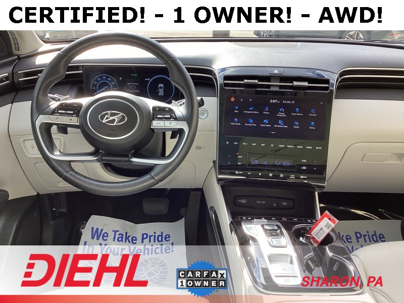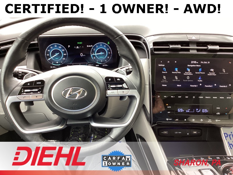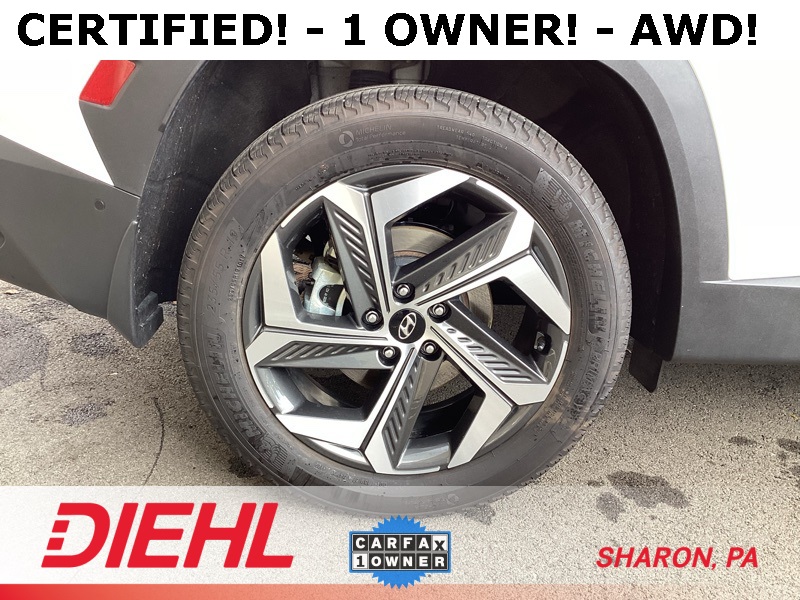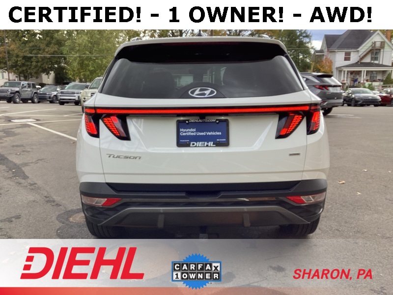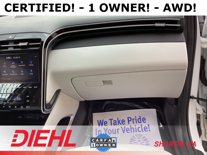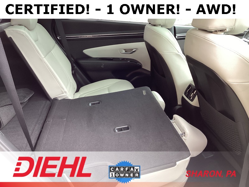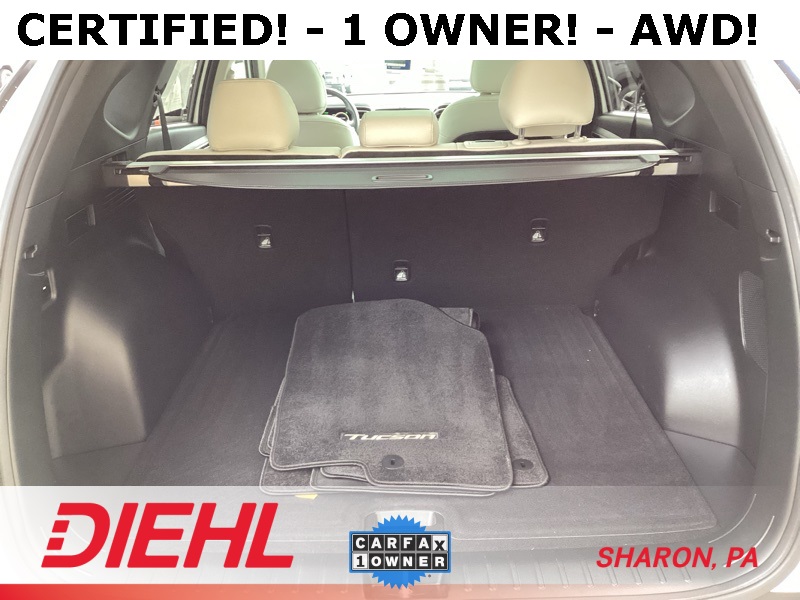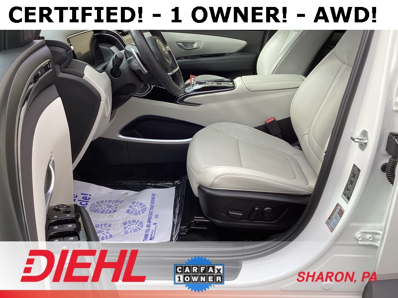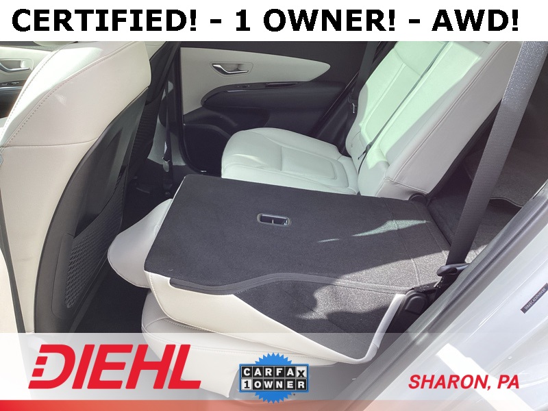 **ONE-OWNER**, **APPLE CAR PLAY**, **ANDROID AUTO**, **CERTIFIED PRE OWNED**, AWD, 3.648 Axle Ratio, 4-Wheel Disc Brakes, 8 Speakers, ABS brakes, Air Conditioning, Alloy wheels, AM/FM radio: SiriusXM, Apple CarPlay & Android Auto, Auto High-beam Headlights, Auto-dimming Rear-View mirror, Automatic temperature control, Brake assist, Bumpers: body-color, Cargo Tray, Carpeted Floor Mats, Delay-off headlights, Driver door bin, Driver vanity mirror, Dual front impact airbags, Dual front side impact airbags, Electronic Stability Control, Emergency communication system: Blue Link Connected Car Service (3-year complimentary subscription), Four wheel independent suspension, Front anti-roll bar, Front Bucket Seats, Front Center Armrest, Front dual zone A/C, Front reading lights, Fully automatic headlights, Garage door transmitter: HomeLink, Heated & Ventilated Front Bucket Seats, Heated door mirrors, Heated front seats, Heated rear seats, Heated steering wheel, Illuminated entry, Leather Seat Trim, Low tire pressure warning, Memory seat, Navigation System, Occupant sensing airbag, Option Group 01, Outside temperature display, Overhead airbag, Overhead console, Panic alarm, Passenger door bin, Passenger vanity mirror, Power door mirrors, Power driver seat, Power Liftgate, Power moonroof, Power passenger seat, Power steering, Power windows, Radio data system, Radio: Bose Premium w/AM/FM/HD/SiriusXM Audio System, Rain sensing wipers, Rear anti-roll bar, Rear reading lights, Rear seat center armrest, Rear window defroster, Rear window wiper, Remote keyless entry, Roof rack: rails only, Security system, Speed control, Split folding rear seat, Spoiler, Steering wheel mounted audio controls, Tachometer, Telescoping steering wheel, Tilt steering wheel, Tow Hitch, Traction control, Trip computer, Turn signal indicator mirrors, Variably intermittent wipers, Ventilated front seats, Wheels: 19" x 7.5J" Machine-Face Finish Alloy. Certified. Serenity White Pearl 2023 Hyundai Tucson Limited AWD 8-Speed Automatic with SHIFTRONIC 2.5L I4 DGI DOHC 16V LEV3-ULEV70 187hp