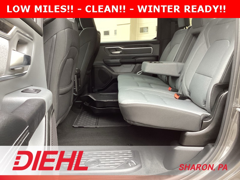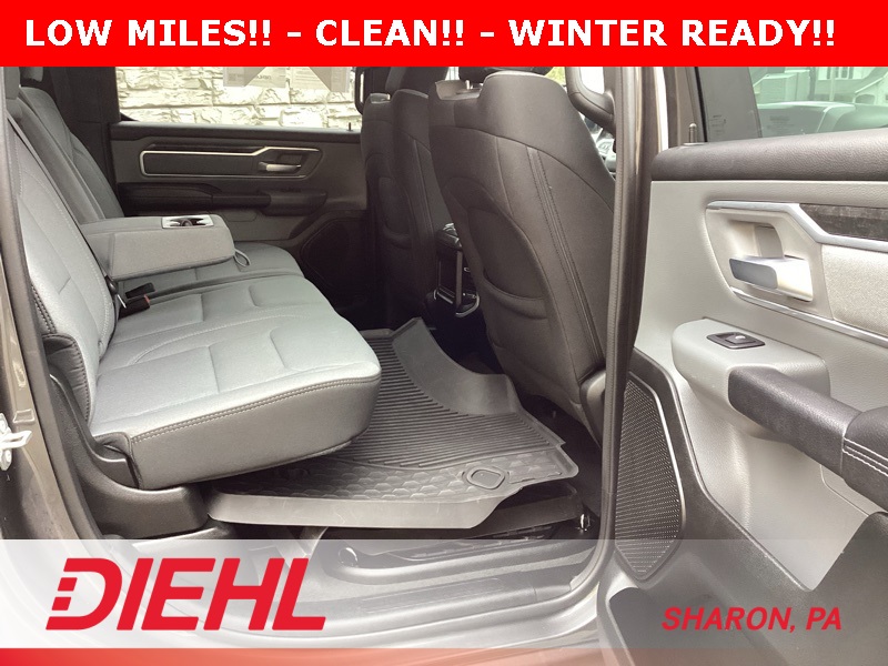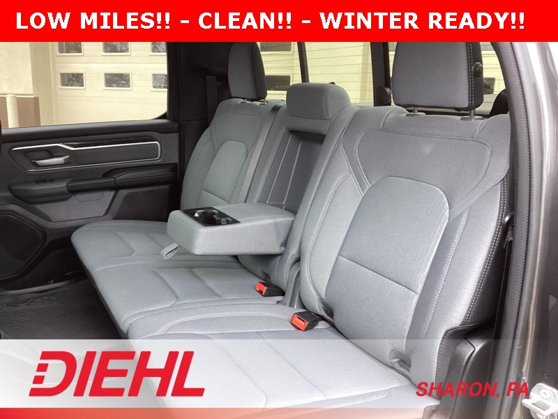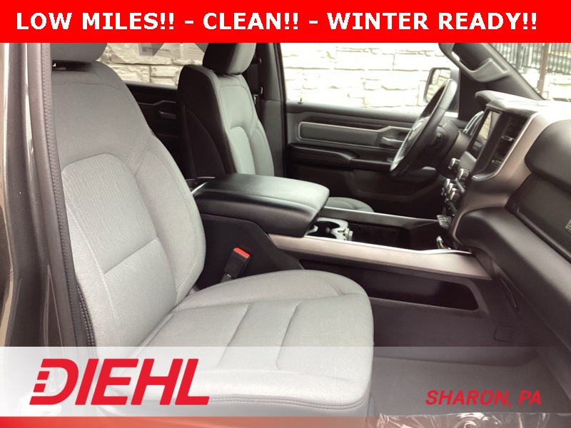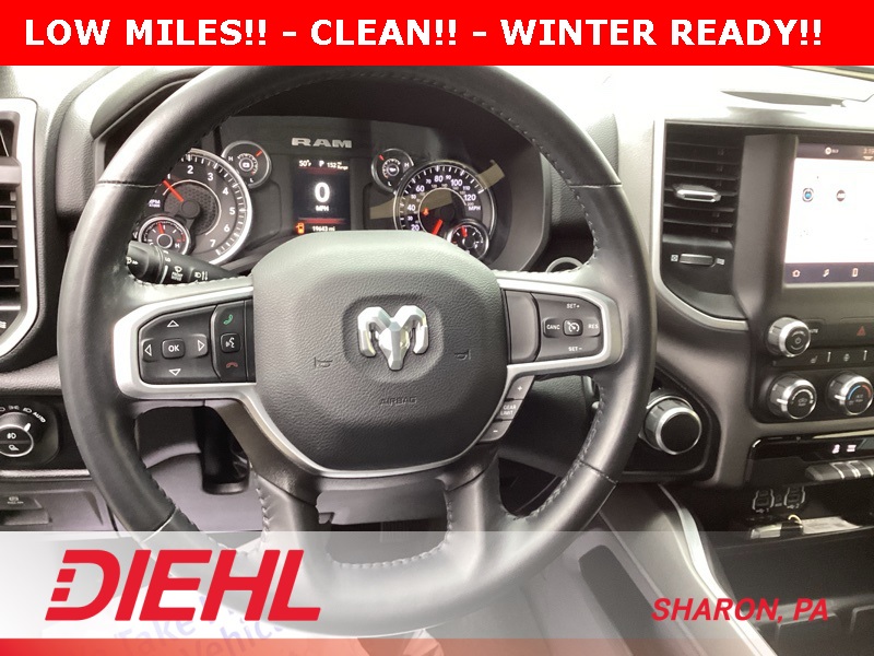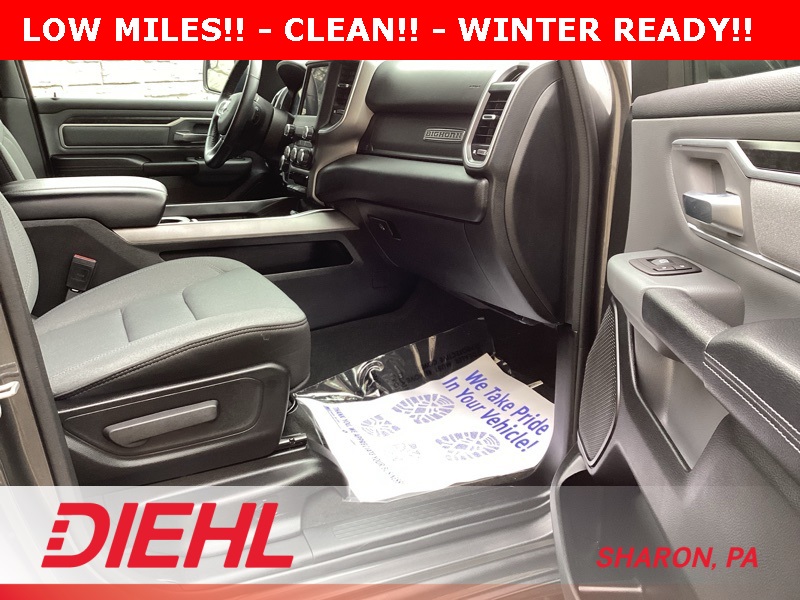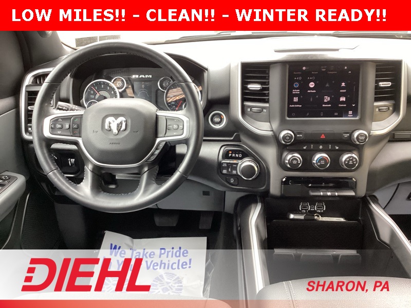 2nd Row In Floor Storage Bins, 3 Rear Seat Head Restraints, 3.21 Rear Axle Ratio, 4 Way Front Headrests, 4-Wheel Disc Brakes, 48V Belt Starter Generator, 4G LTE Wi-Fi Hot Spot, 6 Speakers, 8.4" Touchscreen Display, ABS brakes, Air Conditioning, Alloy wheels, AM/FM radio, Apple CarPlay, Auto-Dimming Exterior Driver Mirror, Auto-Dimming Rear-View Mirror, Big Horn Badge, Big Horn Level 1 Equipment Group, Black Exterior Mirrors, Black Premium Power Mirrors, Bluetooth Handsfree Phone & Audio, Brake assist, Bumpers: chrome, Class IV Receiver Hitch, Cloth Bench Seat, Compass, Connectivity - US/Canada, Convex Wide-Angle Exterior Mirror Insert, Delay-off headlights, Driver door bin, Dual front impact airbags, Dual front side impact airbags, Electric Shift-On-Demand Transfer Case, Electronic Stability Control, Emergency communication system: SiriusXM Guardian, Exterior Mirrors Courtesy Lamps, Exterior Mirrors w/Heating Element, Exterior Mirrors w/Supplemental Signals, For Details, Visit DriveUconnect.com, For More Info, Call 800-643-2112, Front anti-roll bar, Front Center Armrest w/Storage, Front Fog Lamps, Front reading lights, Front Seat Back Map Pockets, Front wheel independent suspension, Fully automatic headlights, Global Telematics Box Module (TBM), Glove Box Lamp, Google Android Auto, GPS Antenna Input, Heated door mirrors, Heated Front Seats, Heated Steering Wheel, Illuminated entry, Integrated Center Stack Radio, Integrated Voice Command w/Bluetooth, Leather steering wheel, Low tire pressure warning, MOPAR Front & Rear Rubber Floor Mats, Occupant sensing airbag, Outside temperature display, Overhead airbag, Overhead console, Panic alarm, ParkView Rear Back-Up Camera, Passenger door bin, Passenger Sun Visor w/Illuminated Mirror, Passenger vanity mirror, Power door mirrors, Power steering, Power windows, Power-Folding Mirrors, Quick Order Package 23Z Big Horn, Radio data system, Radio: Uconnect 3 w/5" Display, Radio: Uconnect 5 W w/8.4" Display, RAM Grille Badge - Chrome, Rear 60/40 Folding Seat, Rear anti-roll bar, Rear Dome w/On/Off Switch Lamp, Rear Power Sliding Window, Rear seat center armrest, Rear step bumper, Rear Wheelhouse Liners, Rear Window Defroster, Remote keyless entry, Remote Start System, SiriusXM Satellite Radio, Speed control, Split folding rear seat, Steering wheel mounted audio controls, Tachometer, Telescoping steering wheel, Tilt steering wheel, Traction control, Trip computer, USB Host Flip, Variably intermittent wipers, Voltmeter, Wheels: 18" x 8" Cast-Aluminum Painted. Granite Crystal Metallic Clearcoat 2023 Ram 1500 Big Horn/Lone Star 4WD 8-Speed Automatic 3.6L V6 24V VVT