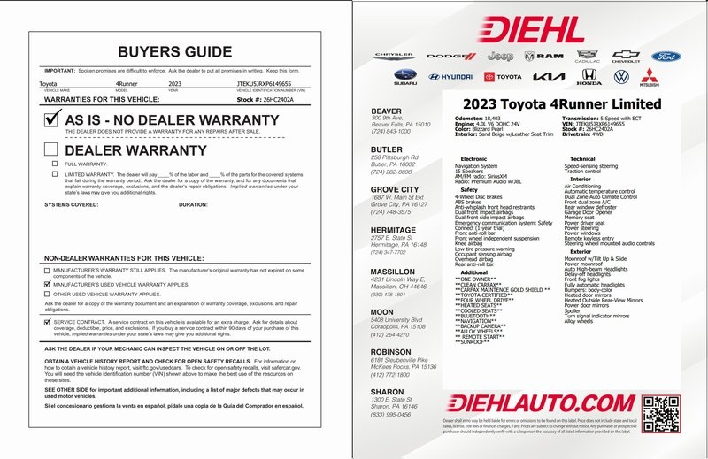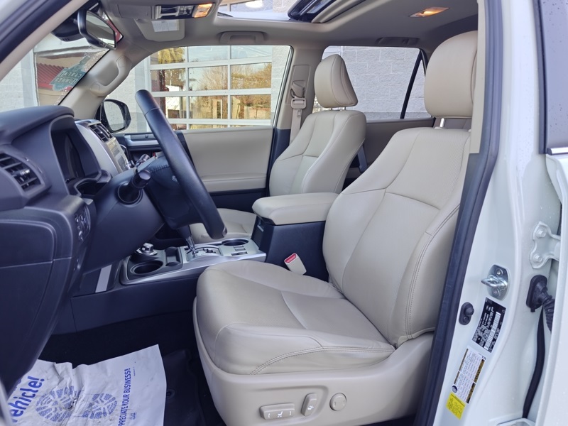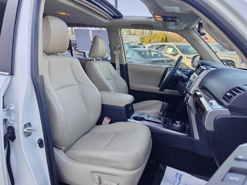 Blizzard Pearl 2023 Toyota 4Runner Limited 4D Sport Utility 4WD 4.0L V6 DOHC 24V 5-Speed with ECT 4Runner Limited, Toyota Gold Certified Certified, 4WD, Sand Beige w/Leather Seat Trim, 4-Wheel Disc Brakes, ABS brakes, Auto High-beam Headlights, Automatic temperature control, Delay-off headlights, Dual Zone Auto Climate Control, Front fog lights, Front wheel independent suspension, Fully automatic headlights, Garage Door Opener, Garage door transmitter: HomeLink, Heated & Ventilated Front Bucket Seats, Heated front seats, Low tire pressure warning, Memory seat, Moonroof w/Tilt Up & Slide, Navigation System, Power driver seat, Power moonroof, Power passenger seat, Remote keyless entry, Steering wheel mounted audio controls, Telescoping steering wheel, Tilt steering wheel, 15 Speakers, 3.727 Axle Ratio, Air Conditioning, Alloy wheels, AM/FM radio: SiriusXM, Anti-whiplash front head restraints, Apple CarPlay/Android Auto, Auto-dimming Rear-View mirror, Brake assist, Bumpers: body-color, Compass, Driver door bin, Driver vanity mirror, Dual front impact airbags, Dual front side impact airbags, Electronic Stability Control, Emergency communication system: Safety Connect (1-year trial), Front anti-roll bar, Front Bucket Seats, Front Center Armrest, Front dual zone A/C, Front reading lights, Heated door mirrors, Heated Outside Rear-View Mirrors, Illuminated entry, Knee airbag, Leather Seat Trim, Occupant sensing airbag, Outside temperature display, Overhead airbag, Overhead console, Panic alarm, Panoramic Back Monitor, Passenger door bin, Passenger vanity mirror, Power door mirrors, Power steering, Power windows, Radio: Premium Audio w/JBL, Rear anti-roll bar, Rear seat center armrest, Rear window defroster, Rear window wiper, Security system, Silver Roof Rails, Speed control, Speed-sensing steering, Split folding rear seat, Spoiler, Tachometer, Traction control, Trip computer, Turn signal indicator mirrors, Variably intermittent wipers, Ventilated front seats, and Wheels: 20" Unique Dual 6-Spoke Alloy. Odometer is 21078 miles below market average!