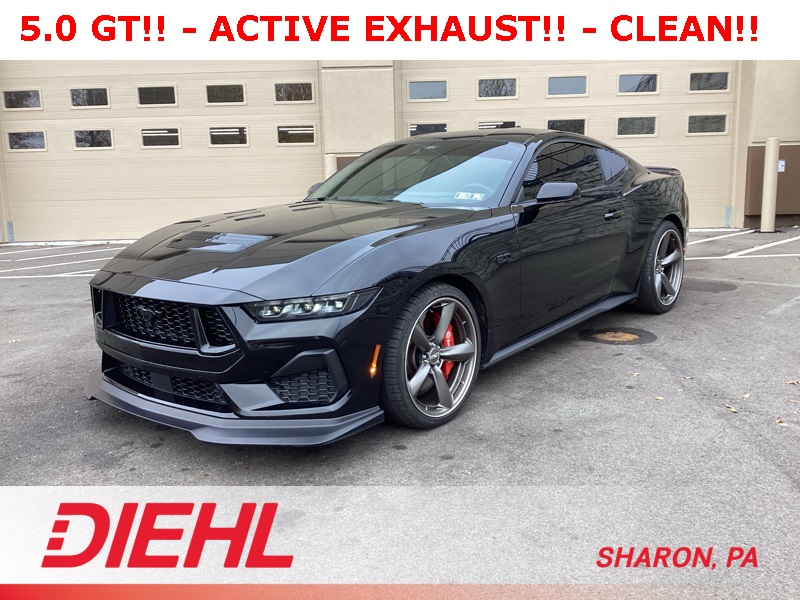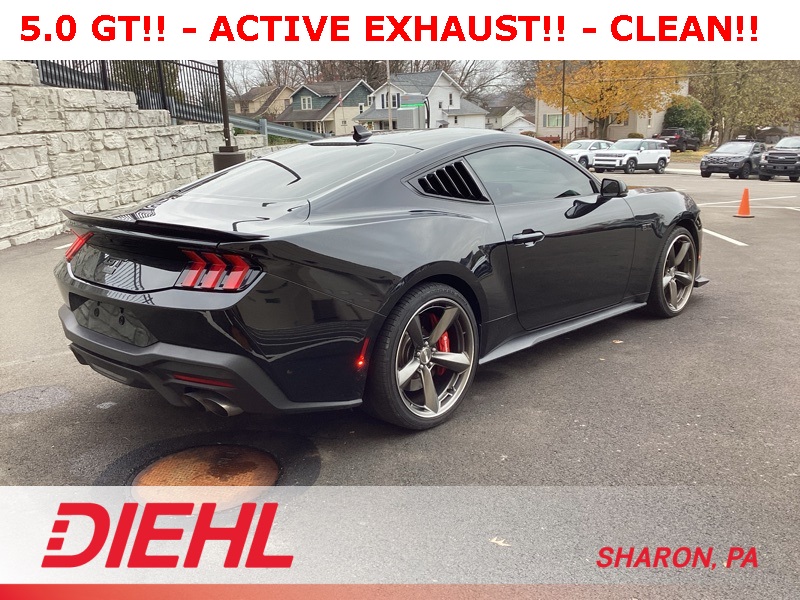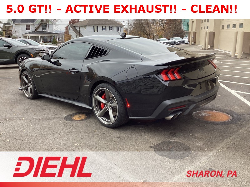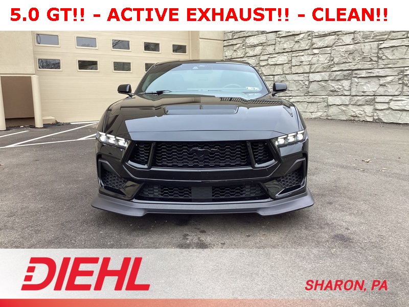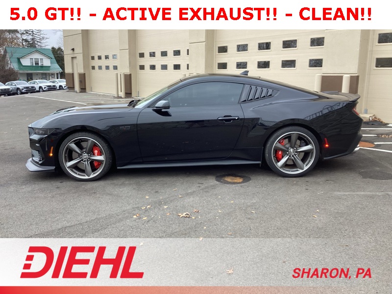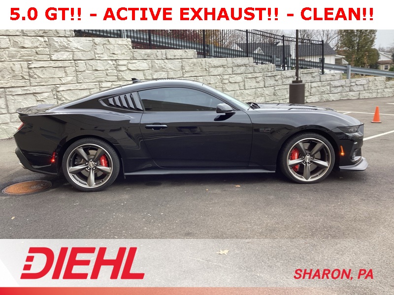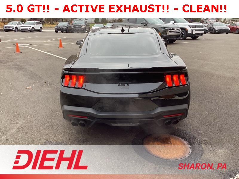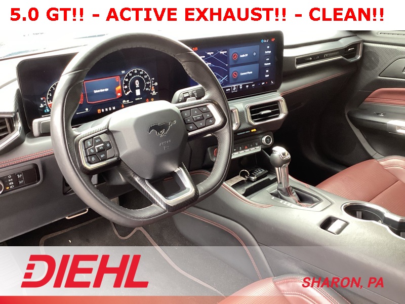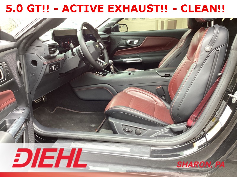**ONE-OWNER**, **HEATED SEATS**, **BLIND SPOT MONITOR**, **BACKUP CAMERA**, **POWER DRIVERS SEAT**, **PREMIUM SOUND SYSTEM**, **LEATHER SEATS**, **NAVIGATION**, **APPLE CAR PLAY**, 19" Branded Brake System w/Performance Linings, 4-Wheel Disc Brakes, ABS brakes, Active Anti-Theft System, Active Valve Performance Exhaust, Air Conditioning, Alloy wheels, AM/FM Stereo, Auto High-beam Headlights, Automatic temperature control, B&O Sound System by Bang & Olufsen, Black GT Pony Badges, Black Mirror Caps, Brake assist, Bumpers: body-color, Compass, Connected Built-In Navigation, Delay-off headlights, Driver door bin, Driver vanity mirror, Dual front impact airbags, Dual front side impact airbags, Electronic Stability Control, Emergency communication system: 911 Assist, Equipment Group 401A High Package, Exterior Parking Camera Rear, Ford Co-Pilot360 Assist+, Four wheel independent suspension, Front anti-roll bar, Front Bucket Seats, Front Center Armrest, Front reading lights, Fully automatic headlights, HD Radio, Headlamps w/Black Bezels, Illuminated Door-Sill Scuff Plates, Illuminated entry, Integrated Turn Signals, Knee airbag, Leather Shift Knob, Leather steering wheel, Leather-Trimmed Bucket Seats w/Color Accents, Locking Center Console, Low tire pressure warning, Memory Driver Seat & Mirrors, Mustang Nite Pony Package, Occupant sensing airbag, Outside temperature display, Overhead airbag, Overhead console, Painted Black Roof, Panic alarm, Passenger door bin, Passenger vanity mirror, Power door mirrors, Power steering, Power windows, Pre-Collision Assist w/Automatic Emergency Braking, Radio data system, Rain sensing wipers, Rear anti-roll bar, Rear Parking Sensors, Rear window defroster, Red Painted Brake Calipers w/White Logo, Remote keyless entry, Security Package, SiriusXM w/360L, Speed control, Speed-sensing steering, Speed-Sensitive Wipers, Split folding rear seat, Spoiler, Sport steering wheel, Steering wheel mounted audio controls, SYNC 4.0 QNX, Tachometer, Telescoping steering wheel, Tilt steering wheel, Traction control, Trip computer, Variably intermittent wipers, Voltmeter, Wheel Locking Kit, Wheels: 19" x 8.5" Ebony Black-Painted Aluminum. Shadow Black 2024 Ford Mustang GT Premium RWD 10-Speed Automatic 5.0L V8 Ti-VCT