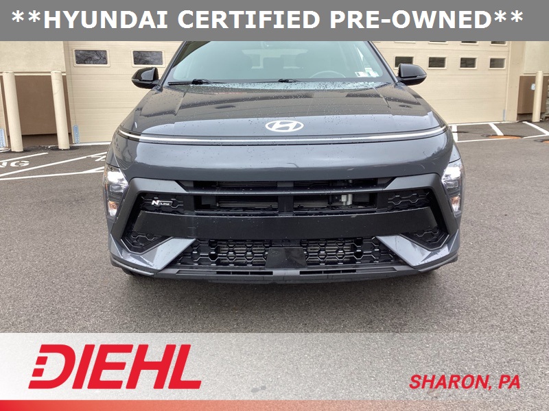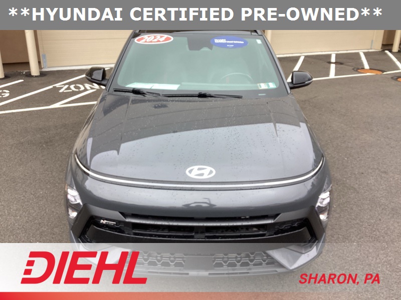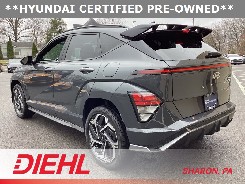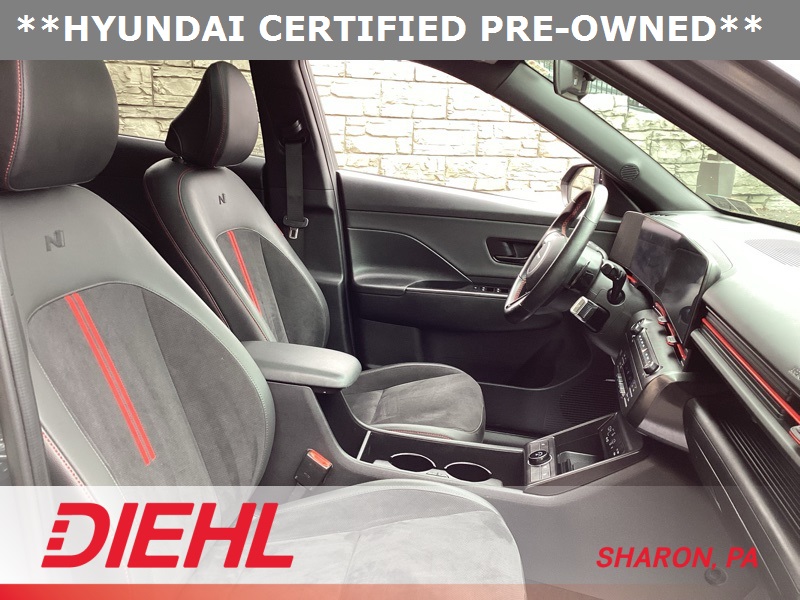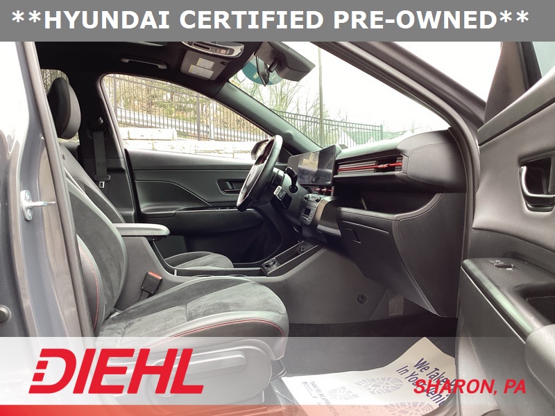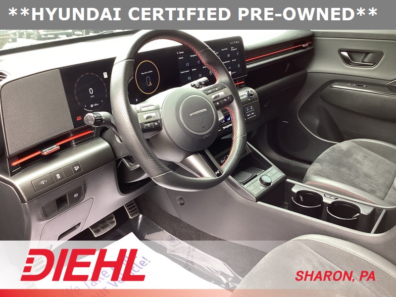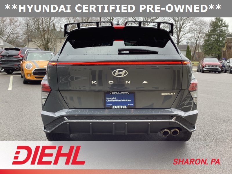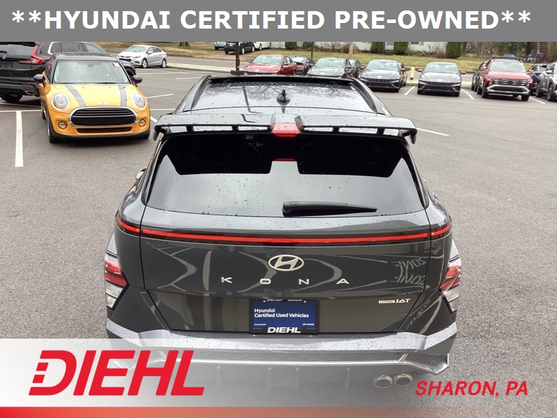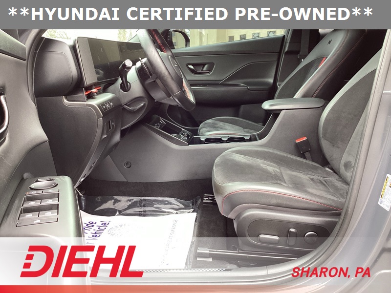 **CERTIFIED PRE OWNED**, 3.510 Axle Ratio, 4-Wheel Disc Brakes, 8 Speakers, ABS brakes, Air Conditioning, Alloy wheels, AM/FM radio: SiriusXM, Apple CarPlay & Android Auto, Auto High-beam Headlights, Auto-dimming Rear-View mirror, Automatic temperature control, Brake assist, Bumpers: body-color, Cargo Net, Cargo Tray, Carpeted Floor Mats, Column-Mounted Shift-By-Wire, Delay-off headlights, Driver door bin, Driver vanity mirror, Dual front impact airbags, Dual front side impact airbags, Electronic Stability Control, Emergency communication system: Bluelink+, Exterior Parking Camera Rear, First Aid Kit, Four wheel independent suspension, Front anti-roll bar, Front Bucket Seats, Front Center Armrest, Front dual zone A/C, Front reading lights, Fully automatic headlights, Heated door mirrors, Heated front seats, Heated Front Sport Bucket Seats, Illuminated entry, Leather Shift Knob, Leather steering wheel, Low tire pressure warning, N-Line Alcantara Sport Combination Seat Trim, Navigation System, Occupant sensing airbag, Option Group 01, Outside temperature display, Overhead airbag, Panic alarm, Passenger door bin, Passenger vanity mirror, Power door mirrors, Power driver seat, Power moonroof, Power steering, Power windows, Radio: AM/FM/HD Radio/SiriusXM Audio System, Rear anti-roll bar, Rear seat center armrest, Rear window defroster, Rear window wiper, Remote keyless entry, Security system, Speed control, Speed-sensing steering, Split folding rear seat, Spoiler, Steering wheel mounted audio controls, Tachometer, Telescoping steering wheel, Tilt steering wheel, Traction control, Trip computer, Turn signal indicator mirrors, Variably intermittent wipers, Wheel Locks, Wheels: 19" x 7.5J Metallic Alloy. Certified. Ecotronic Gray Pearl 2024 Hyundai Kona N Line AWD 8-Speed Automatic I4