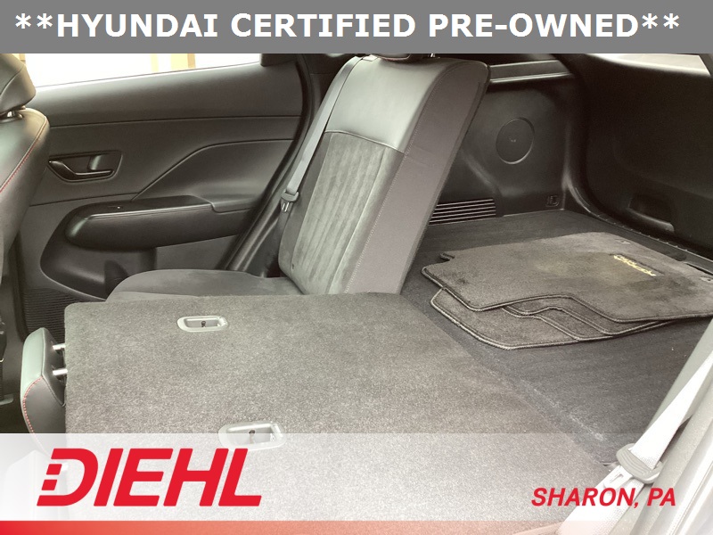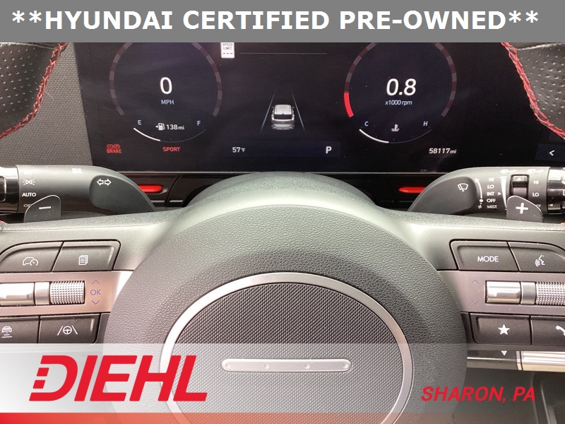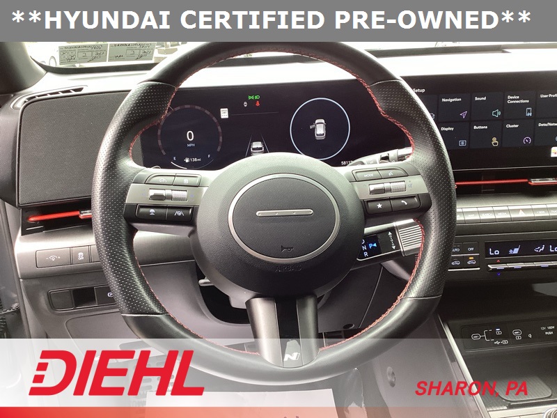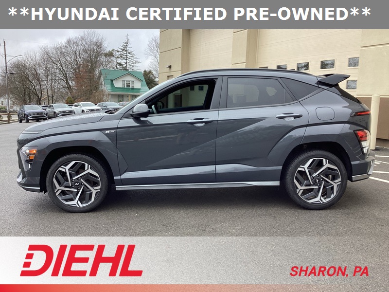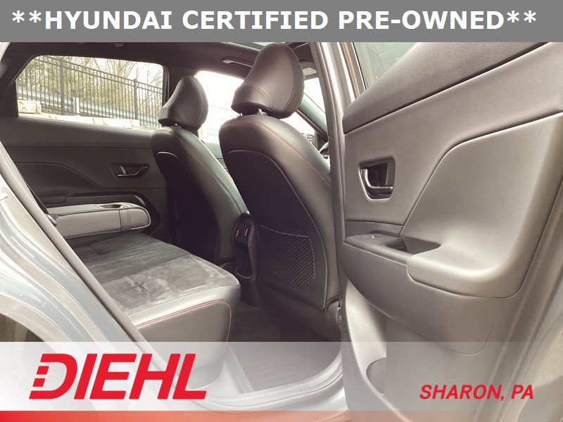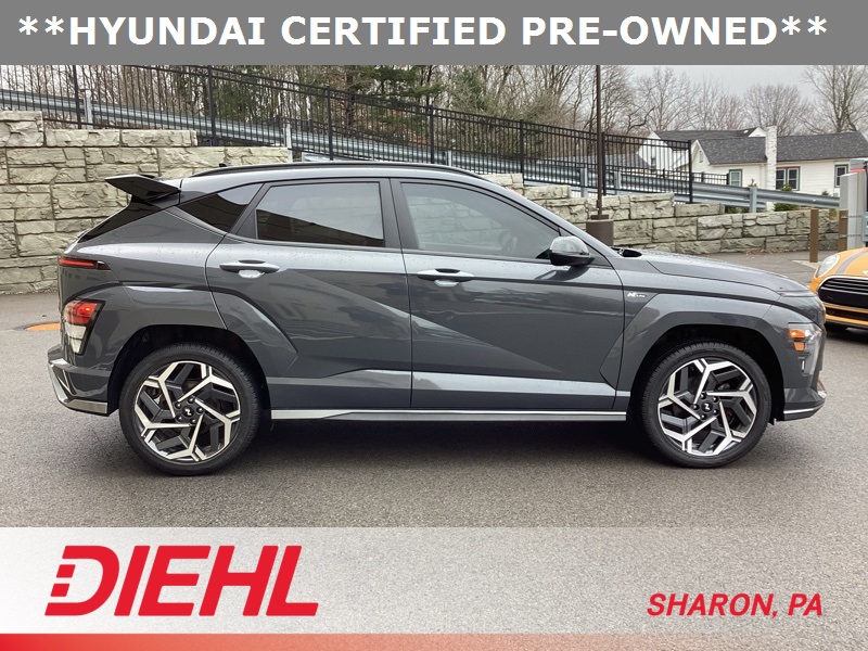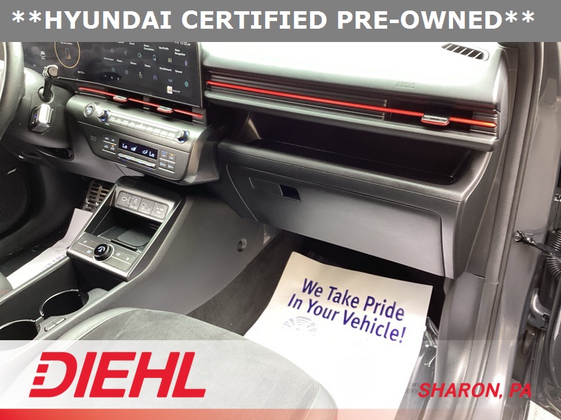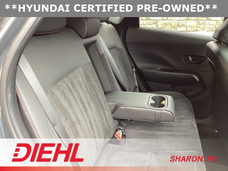 **CERTIFIED PRE OWNED**, 3.510 Axle Ratio, 4-Wheel Disc Brakes, 8 Speakers, ABS brakes, Air Conditioning, Alloy wheels, AM/FM radio: SiriusXM, Apple CarPlay & Android Auto, Auto High-beam Headlights, Auto-dimming Rear-View mirror, Automatic temperature control, Brake assist, Bumpers: body-color, Cargo Net, Cargo Tray, Carpeted Floor Mats, Column-Mounted Shift-By-Wire, Delay-off headlights, Driver door bin, Driver vanity mirror, Dual front impact airbags, Dual front side impact airbags, Electronic Stability Control, Emergency communication system: Bluelink+, Exterior Parking Camera Rear, First Aid Kit, Four wheel independent suspension, Front anti-roll bar, Front Bucket Seats, Front Center Armrest, Front dual zone A/C, Front reading lights, Fully automatic headlights, Heated door mirrors, Heated front seats, Heated Front Sport Bucket Seats, Illuminated entry, Leather Shift Knob, Leather steering wheel, Low tire pressure warning, N-Line Alcantara Sport Combination Seat Trim, Navigation System, Occupant sensing airbag, Option Group 01, Outside temperature display, Overhead airbag, Panic alarm, Passenger door bin, Passenger vanity mirror, Power door mirrors, Power driver seat, Power moonroof, Power steering, Power windows, Radio: AM/FM/HD Radio/SiriusXM Audio System, Rear anti-roll bar, Rear seat center armrest, Rear window defroster, Rear window wiper, Remote keyless entry, Security system, Speed control, Speed-sensing steering, Split folding rear seat, Spoiler, Steering wheel mounted audio controls, Tachometer, Telescoping steering wheel, Tilt steering wheel, Traction control, Trip computer, Turn signal indicator mirrors, Variably intermittent wipers, Wheel Locks, Wheels: 19" x 7.5J Metallic Alloy. Certified. Ecotronic Gray Pearl 2024 Hyundai Kona N Line AWD 8-Speed Automatic I4