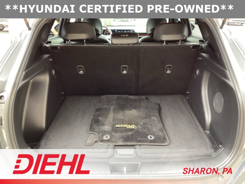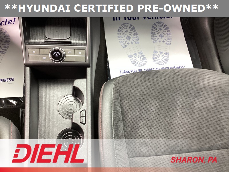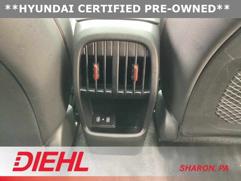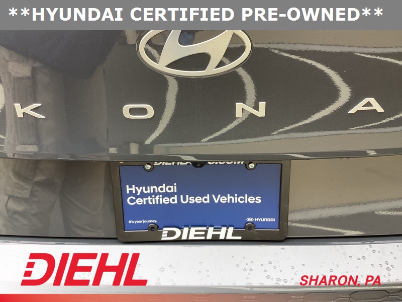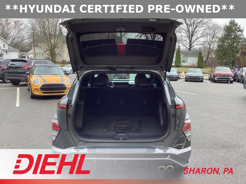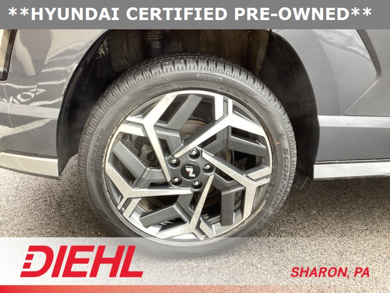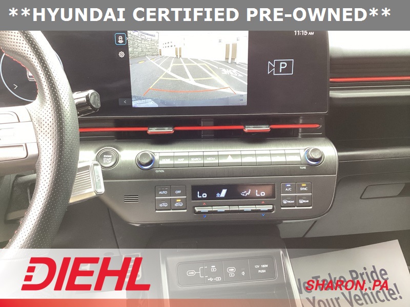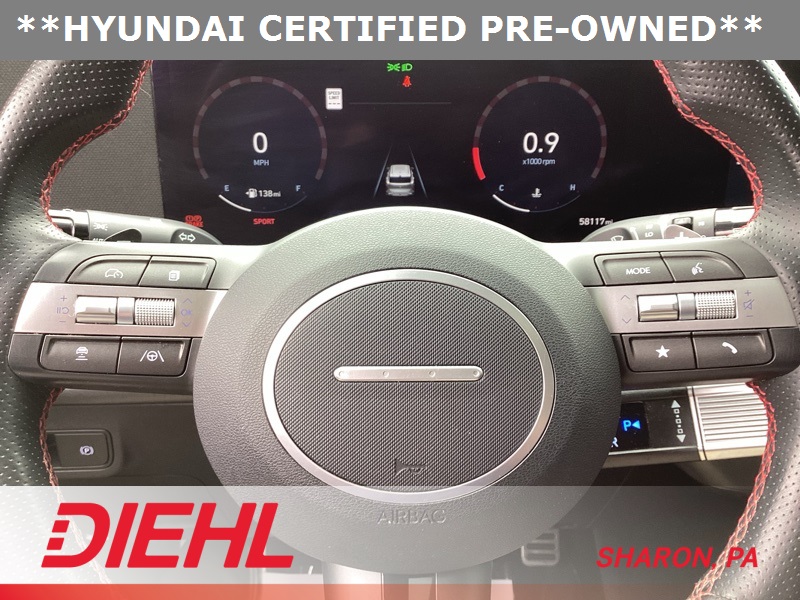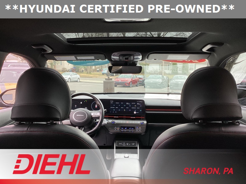 **CERTIFIED PRE OWNED**, 3.510 Axle Ratio, 4-Wheel Disc Brakes, 8 Speakers, ABS brakes, Air Conditioning, Alloy wheels, AM/FM radio: SiriusXM, Apple CarPlay & Android Auto, Auto High-beam Headlights, Auto-dimming Rear-View mirror, Automatic temperature control, Brake assist, Bumpers: body-color, Cargo Net, Cargo Tray, Carpeted Floor Mats, Column-Mounted Shift-By-Wire, Delay-off headlights, Driver door bin, Driver vanity mirror, Dual front impact airbags, Dual front side impact airbags, Electronic Stability Control, Emergency communication system: Bluelink+, Exterior Parking Camera Rear, First Aid Kit, Four wheel independent suspension, Front anti-roll bar, Front Bucket Seats, Front Center Armrest, Front dual zone A/C, Front reading lights, Fully automatic headlights, Heated door mirrors, Heated front seats, Heated Front Sport Bucket Seats, Illuminated entry, Leather Shift Knob, Leather steering wheel, Low tire pressure warning, N-Line Alcantara Sport Combination Seat Trim, Navigation System, Occupant sensing airbag, Option Group 01, Outside temperature display, Overhead airbag, Panic alarm, Passenger door bin, Passenger vanity mirror, Power door mirrors, Power driver seat, Power moonroof, Power steering, Power windows, Radio: AM/FM/HD Radio/SiriusXM Audio System, Rear anti-roll bar, Rear seat center armrest, Rear window defroster, Rear window wiper, Remote keyless entry, Security system, Speed control, Speed-sensing steering, Split folding rear seat, Spoiler, Steering wheel mounted audio controls, Tachometer, Telescoping steering wheel, Tilt steering wheel, Traction control, Trip computer, Turn signal indicator mirrors, Variably intermittent wipers, Wheel Locks, Wheels: 19" x 7.5J Metallic Alloy. Certified. Ecotronic Gray Pearl 2024 Hyundai Kona N Line AWD 8-Speed Automatic I4