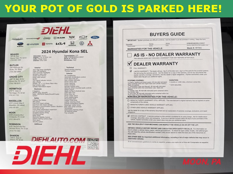 If you are looking for a 2024 Hyundai Kona SEL that blends efficiency, modern tech, and SUV versatility into one stylish package, this is it. With just 44,921 miles, it is ready for its next adventure at Diehl of Moon.