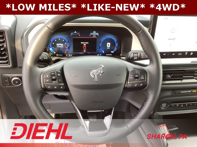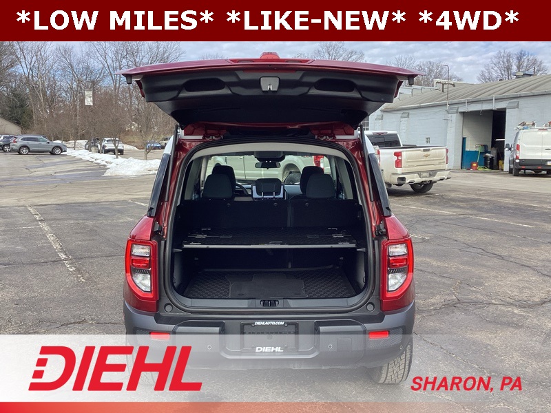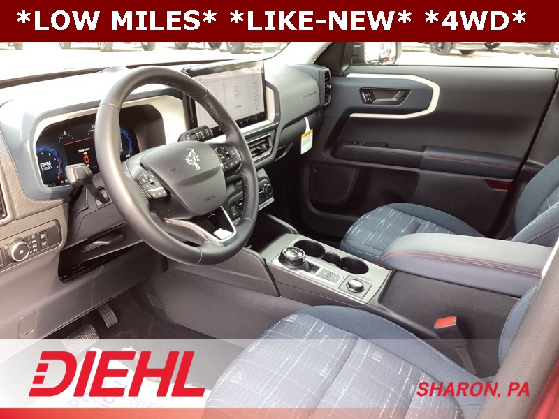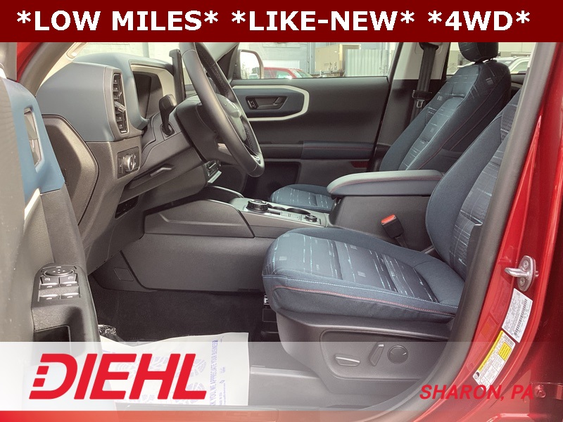 4-Wheel Disc Brakes, 6 Speakers, ABS brakes, Air Conditioning, Alloy wheels, AM/FM radio: SiriusXM, AM/FM Stereo, Auto High-beam Headlights, Automatic temperature control, Brake assist, Cargo Management System (Shelf/Divider/Table), Cargo Mat, Compass, Convenience Package, Delay-off headlights, Driver door bin, Driver vanity mirror, Dual front impact airbags, Dual front side impact airbags, Electronic Stability Control, Emergency communication system: SYNC 4 911 Assist, Equipment Group 250A, Four wheel independent suspension, Front anti-roll bar, Front Bucket Seats, Front Center Armrest, Front Driver/Passenger Seat Back Map Pockets, Front reading lights, Fully automatic headlights, Heated 8-Way Power Driver's Seat, Heated door mirrors, Illuminated entry, Knee airbag, LED Fog Lamps, Low tire pressure warning, Occupant sensing airbag, Outside temperature display, Overhead airbag, Overhead console, Panic alarm, Passenger door bin, Passenger vanity mirror, Plaid Cloth Front Bucket Seats, Power door mirrors, Power steering, Power windows, Premium Wrapped Steering Wheel, Radio data system, Rear anti-roll bar, Rear Parking Sensors, Rear reading lights, Rear seat center armrest, Rear window defroster, Rear window wiper, Remote keyless entry, Security system, SiriusXM, Speed control, Speed-sensing steering, Speed-Sensitive Wipers, Split folding rear seat, Steering wheel mounted audio controls, SYNC 4 w/Enhanced Voice Recognition, Tachometer, Telescoping steering wheel, Tilt steering wheel, Traction control, Trip computer, Universal Garage Door Opener (UGDO), Variably intermittent wipers, Wheels: 17" Oxford White-Painted Aluminum. Ruby Red Metallic Tinted Clearcoat 2025 Ford Bronco Sport Heritage 4WD 8-Speed Automatic 1.5L EcoBoost