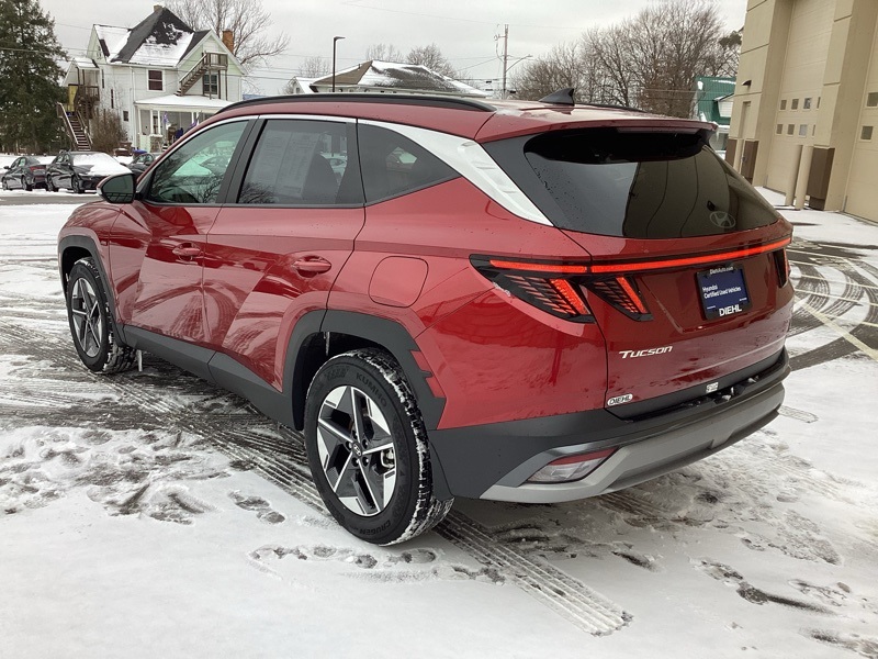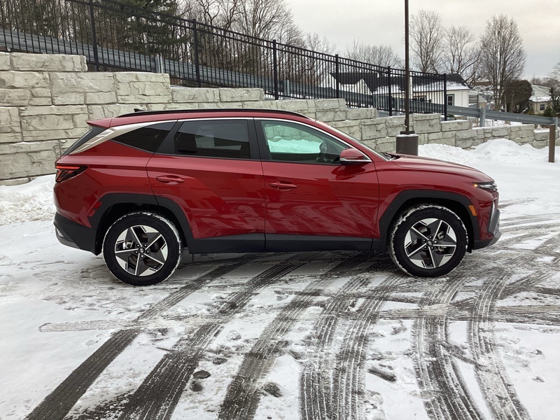 AWD, 18" Alloy Wheels, 4-Wheel Disc Brakes, 6 Speakers, ABS brakes, Air Conditioning, Alloy wheels, AM/FM radio: SiriusXM, Apple CarPlay & Android Auto, Auto High-beam Headlights, Auto-dimming Rear-View mirror, Automatic temperature control, Brake assist, Bumpers: body-color, Cargo Tray, Carpeted Floor Mats, Delay-off headlights, Driver door bin, Driver vanity mirror, Dual front impact airbags, Dual front side impact airbags, Electronic Stability Control, Emergency communication system: Bluelink+, First Aid Kit, Four wheel independent suspension, Front anti-roll bar, Front Bucket Seats, Front Center Armrest, Front dual zone A/C, Front reading lights, Fully automatic headlights, H-Tex Seat Trim, Heated door mirrors, Heated Front Bucket Seats, Heated front seats, Illuminated entry, Leather steering wheel, Low tire pressure warning, Mud Guards, Navigation System, Occupant sensing airbag, Option Group 01, Outside temperature display, Overhead airbag, Overhead console, Panic alarm, Passenger door bin, Passenger vanity mirror, Power door mirrors, Power driver seat, Power Liftgate, Power moonroof, Power steering, Power windows, Radio data system, Radio: AM/FM/HD Audio System, Rear anti-roll bar, Rear Bumper Applique, Rear reading lights, Rear seat center armrest, Rear side impact airbag, Rear window defroster, Rear window wiper, Remote keyless entry, Roadside Assistance Kit, Security system, Speed control, Split folding rear seat, Spoiler, Steering wheel mounted audio controls, Tachometer, Telescoping steering wheel, Tilt steering wheel, Traction control, Trip computer, Turn signal indicator mirrors, Variably intermittent wipers, Wheel Locks. Certified. Ultimate Red 2025 Hyundai Tucson SEL Convenience AWD 8-Speed Automatic with SHIFTRONIC 2.5L I4 DGI DOHC 16V LEV3-SULEV30 187hp