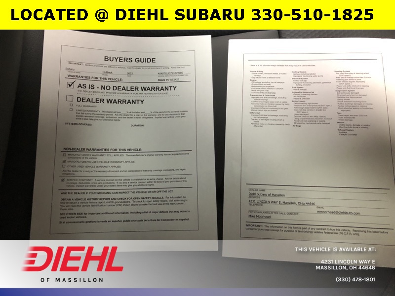 **Clean Carfax**, **One Owner**, **Subaru Certified**, **All Wheel Drive**, **Lane Keep Assist**, **Backup Camera**, **Android Auto/ Apple Carplay**, TRAILER HITCH, Auto-Dimming Exterior Mirror w/Approach Light, Cargo Sidewall Protector, LED Upgrade, Power Moonroof, Power Moonroof & Navigation & RAB, Radio: Subaru 11.6" Multimedia System w/Navigation, Rear Seat Back Protector, Reverse Automatic Braking (RAB) System, Splash Guards, Wilderness Package, Wireless Charger. Certified. 2025 Subaru Outback Wilderness CARFAX One-Owner.